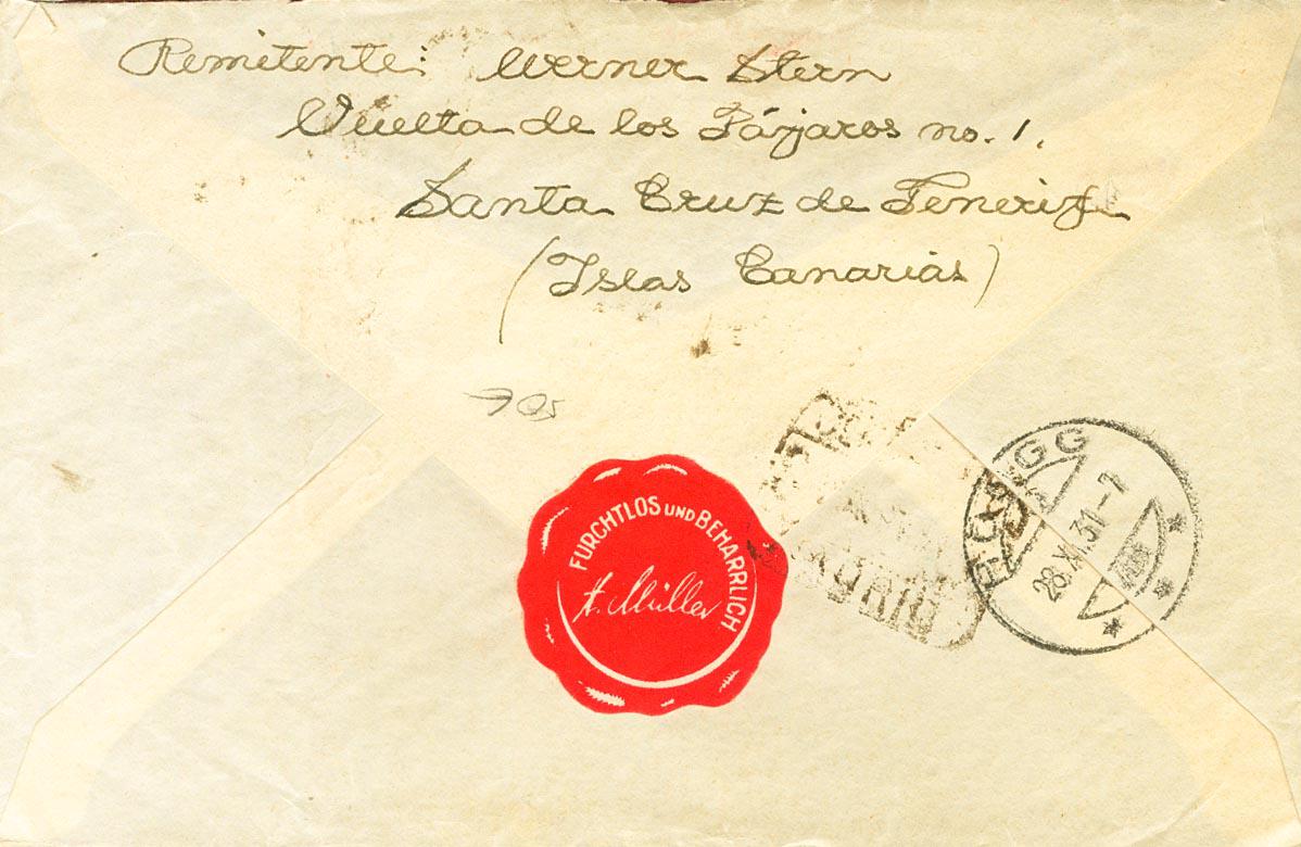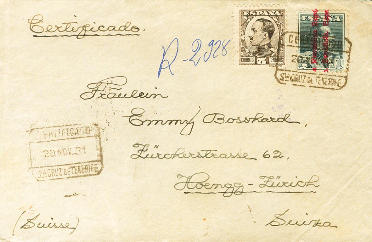 602, 491. 1931. 1 pts pizarra y 5 cts castaño negro. Certificado de SANTA CRUZ DE TENERIFE a ZURICH (SUIZA). Al dorso llegada. MAGNIFICA.
