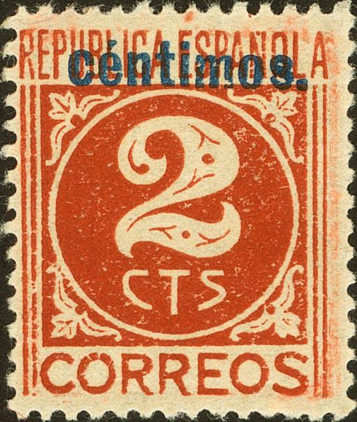 ★ 744hdh. 1938. 45 cts sobre 2 cts castaño. SOBRECARGA DESPLAZADA "CENTIMOS" EN LA PARTE SUPERIOR y SIN "45". MAGNIFICO Y RARO.