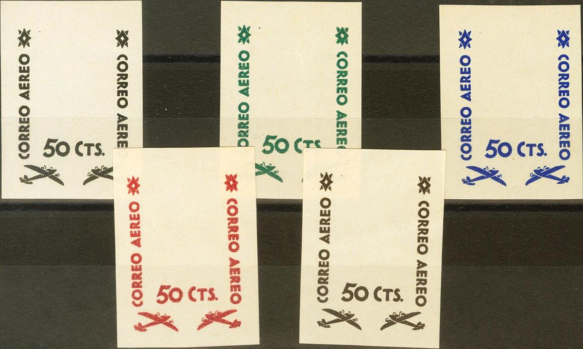 (★) 782P(5). 1938. Conjunto de cinco IMPRONTAS DE LA SOBRECARGA del valor de 50 cts. MAGNIFICAS Y EXTRAORDINARIAMENTE RARAS, NO CATALOGADAS EN GALVEZ.