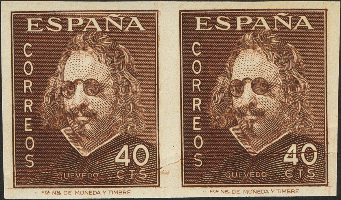 ★★ 989s(2). 1945. 40 cts castaño, pareja (leve doblez natural horizontal, indicado sólo a título informativo). SIN DENTAR. MAGNIFICA. Edifil 2022: +310 Euros