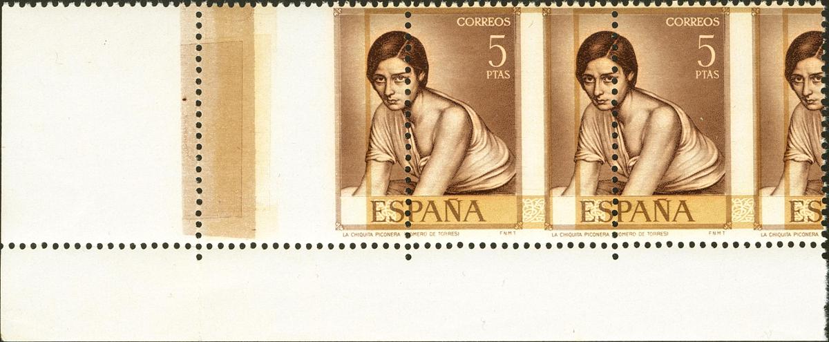 ★★ 1665dh. 1965. 5 cts castaño, tira de tres. COLOR DORADO y DENTADO DESPLAZADO. MAGNIFICA.