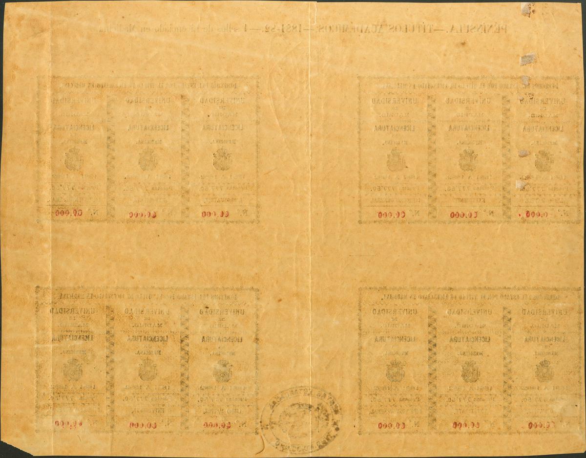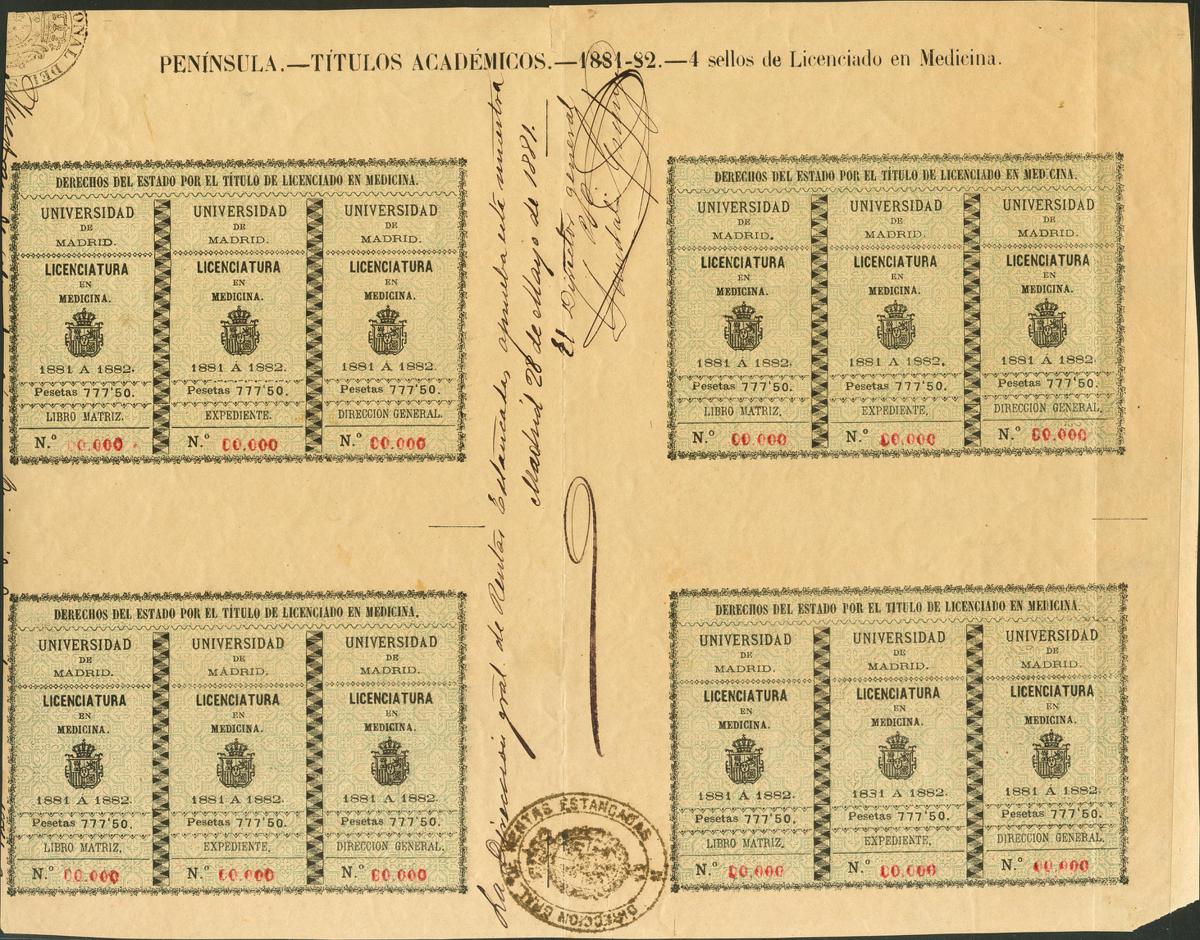 ★1881. 777´50 pts negro sobre verde, pliego completo de cuatro trípticos TITULOS UNIVERSITARIOS-LICENCIATURA EN MEDICINA. Nº0000, en rojo y en el margen firma de aprobación y marca DIRECCION GRAL DE RENTAS ESTANCADAS. MAGNIFICO Y RARISIMO, UNICO CONOCIDO. (Alemany 45)