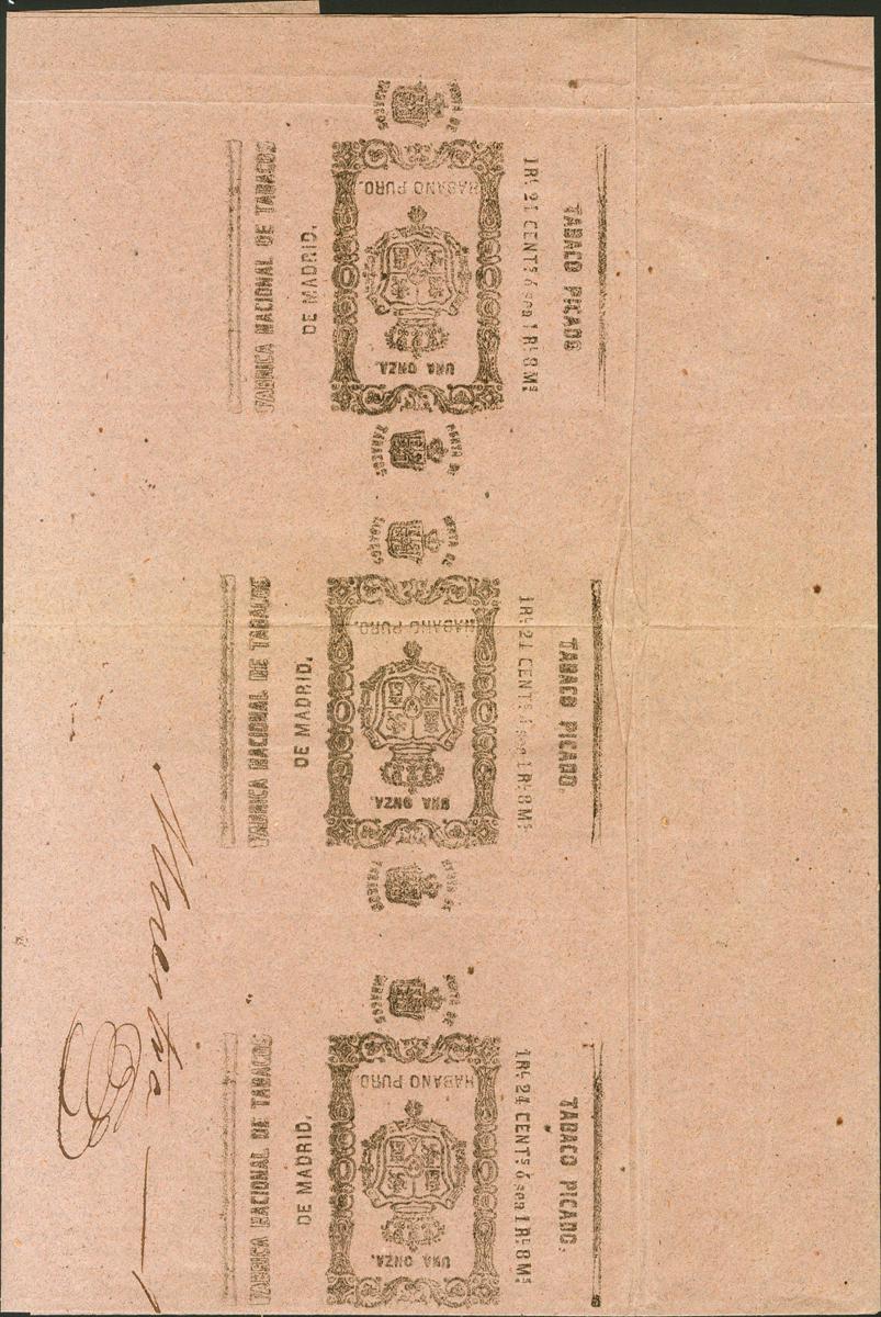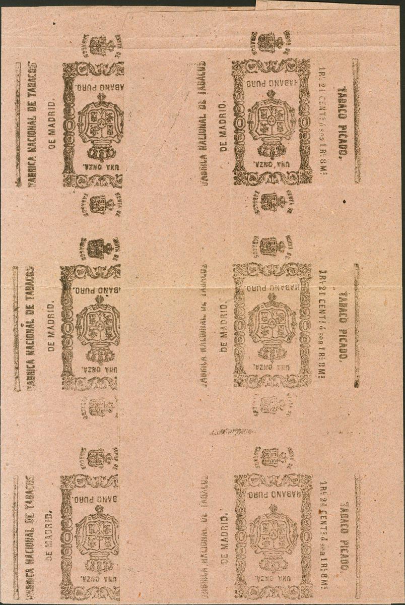 (★)(1860ca). 2 reales y 24 cts negro sobre rosa, pliego completo de dieciséis sellos (pliegues horizontales y verticales). IMPUESTO DEL TABACO, MADRID (1 onza de Habano Puro). BONITO Y RARISIMO COMPLETO.