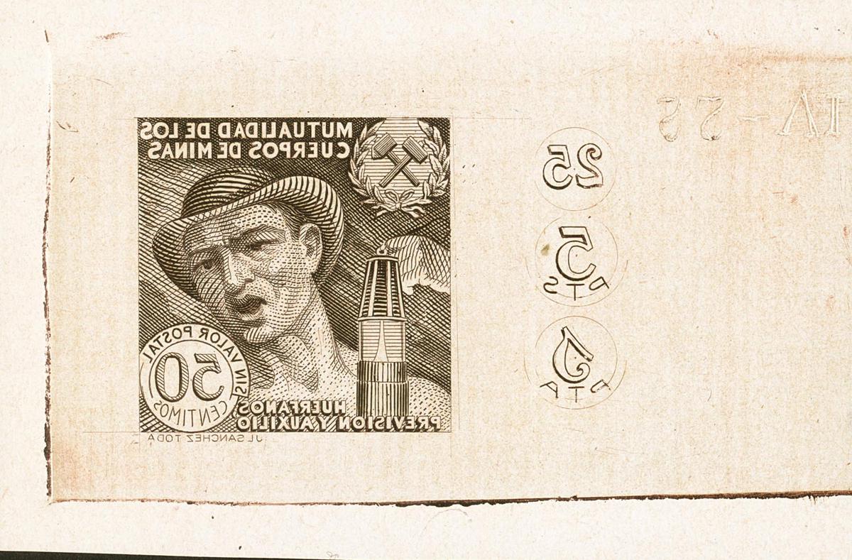 (★)(1940ca). 50 cts negro MUTUALIDAD DE LOS CUERPOS DE MINAS. PRUEBA DE PUNZON EN ESPEJO, con cartuchos en el margen de los valores a aplicar. MAGNIFICA Y RARISIMA.