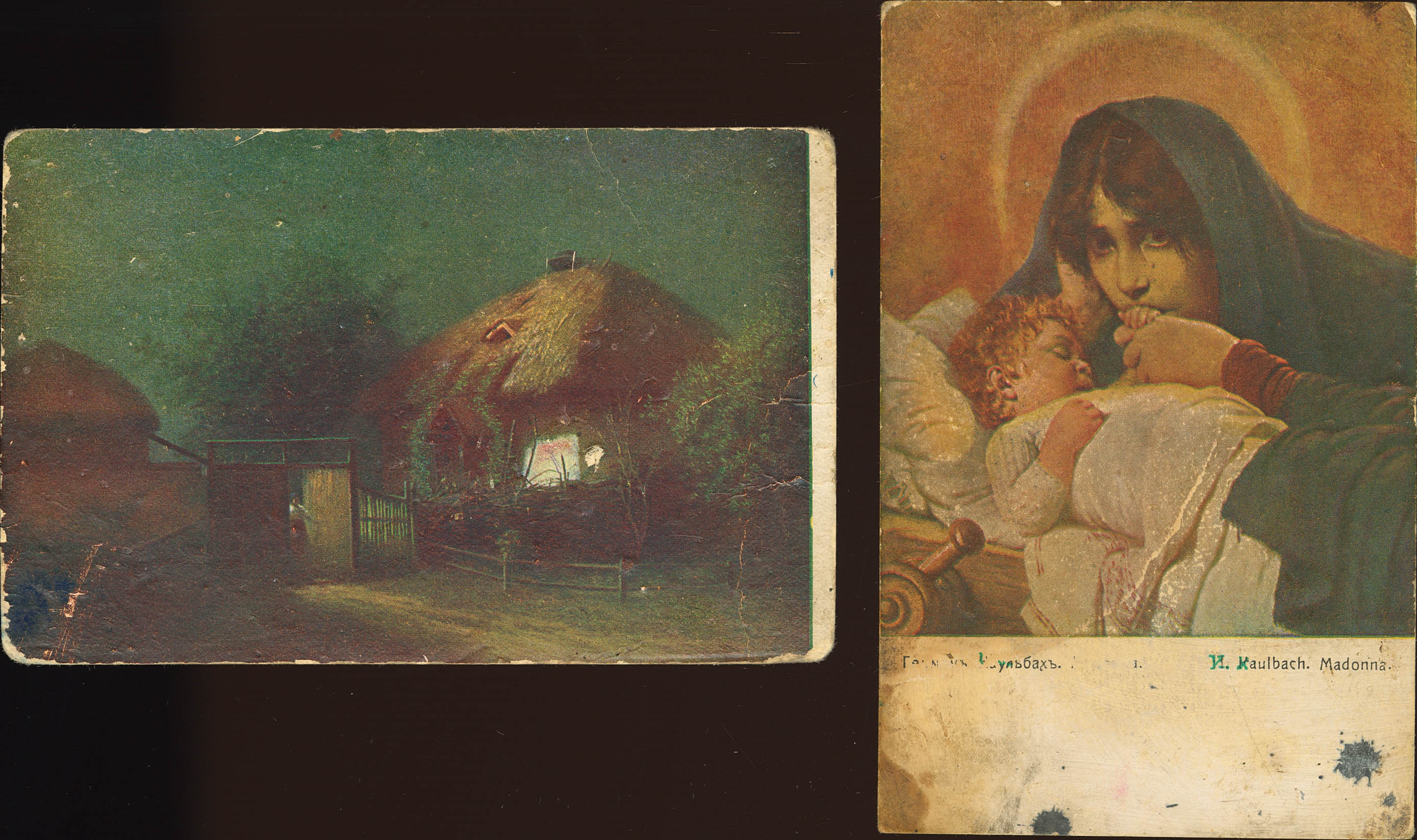 1941. FRENTE DE NOWGOROD (Noviembre). Dos tarjetas postales rusas, una a beneficio de la Cruz Roja, dirigidas a MADRID, circuladas en sobre y sin indicación del número de unidad (muy probablemente Feldpost Nº11371-B) y números a lápiz de los censores. BONITAS Y MUY RARAS.