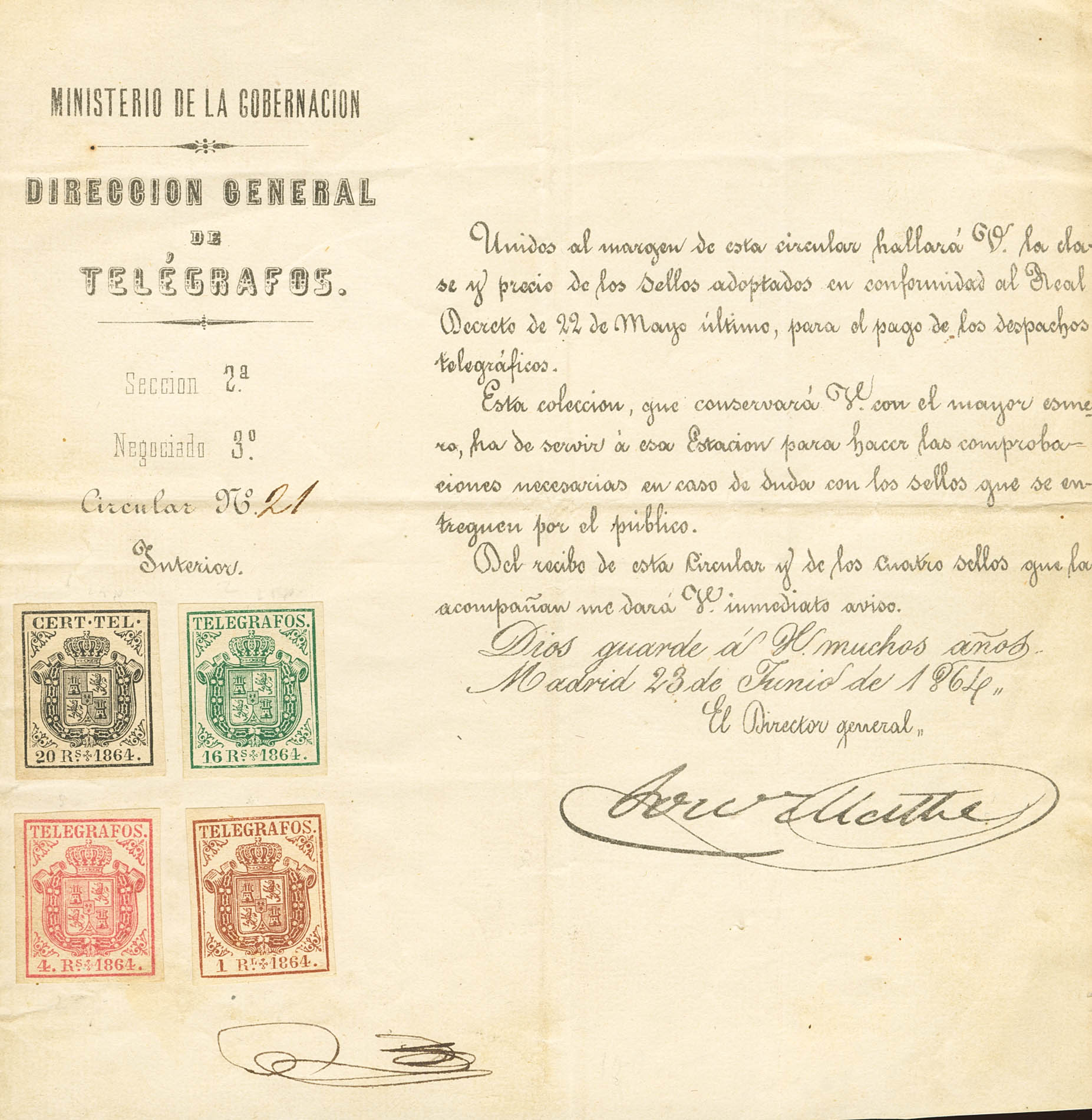 (★) 1/4. 1864. Serie completa, sobre HOJA MODELO de la Dirección General de Telégrafos indicando la puesta en circulación de la 1ª Emisión de Telégrafos. MAGNIFICO Y EXTRAORDINARIAMENTE RARO DOCUMENTO. Cert. GRAUS.