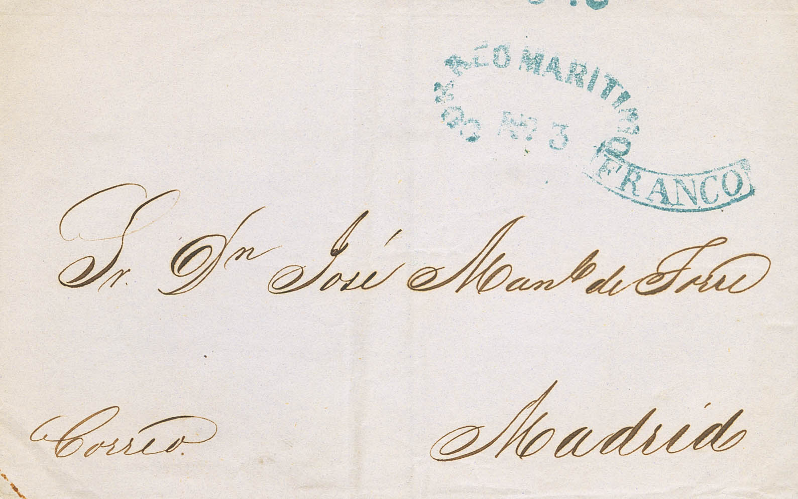 (1845ca). LA HABANA a MADRID. Marcas FRANCO y CORREO MARITIMO / Nº3, ambas en azul (P.E.21 y P.E.46) edición 2004. MAGNIFICA Y RARA.