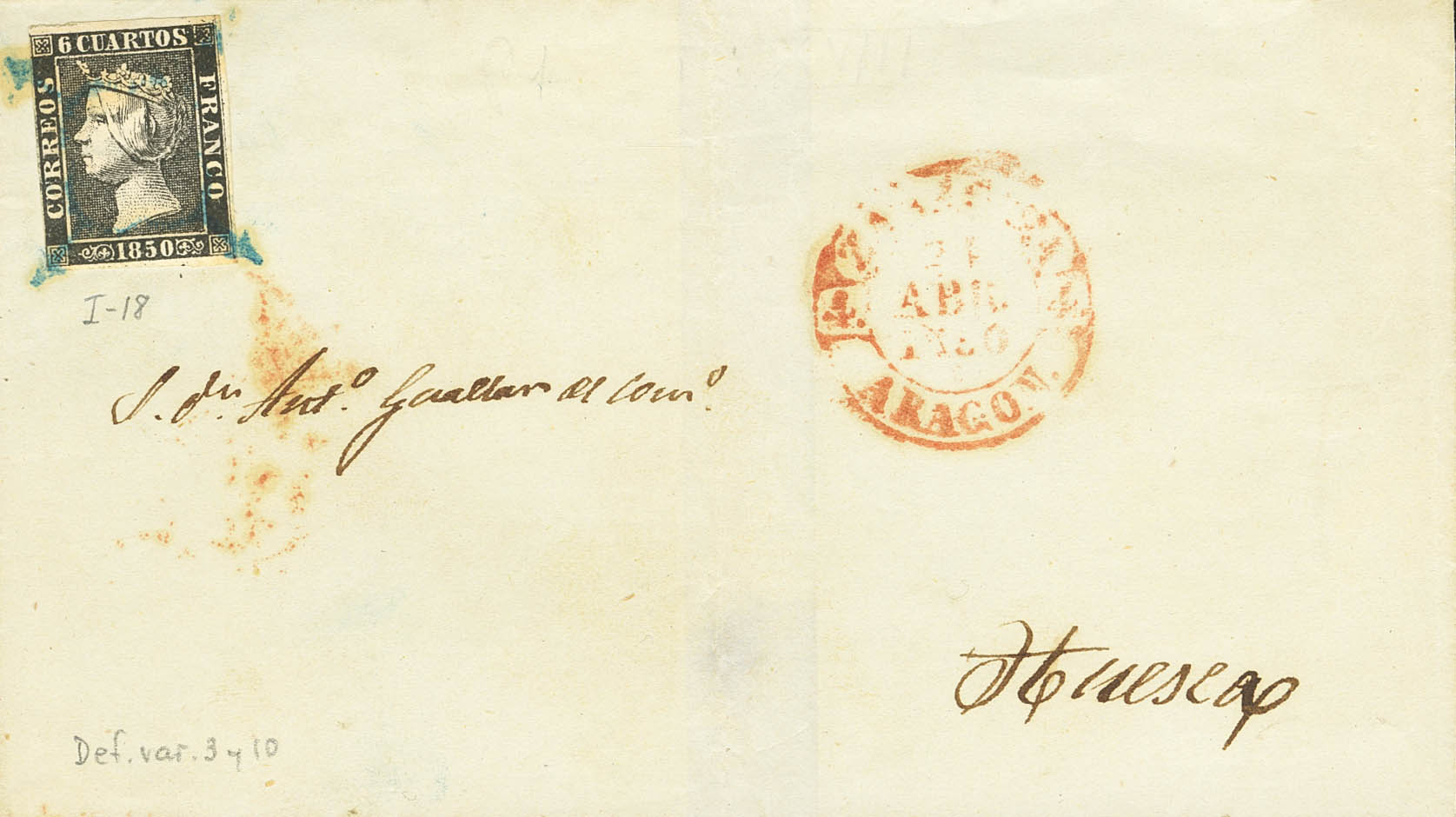 1. 1850. 6 cuartos negro. ZARAGOZA a HUESCA. Matasello ARAÑA, en azul. MAGNIFICA.