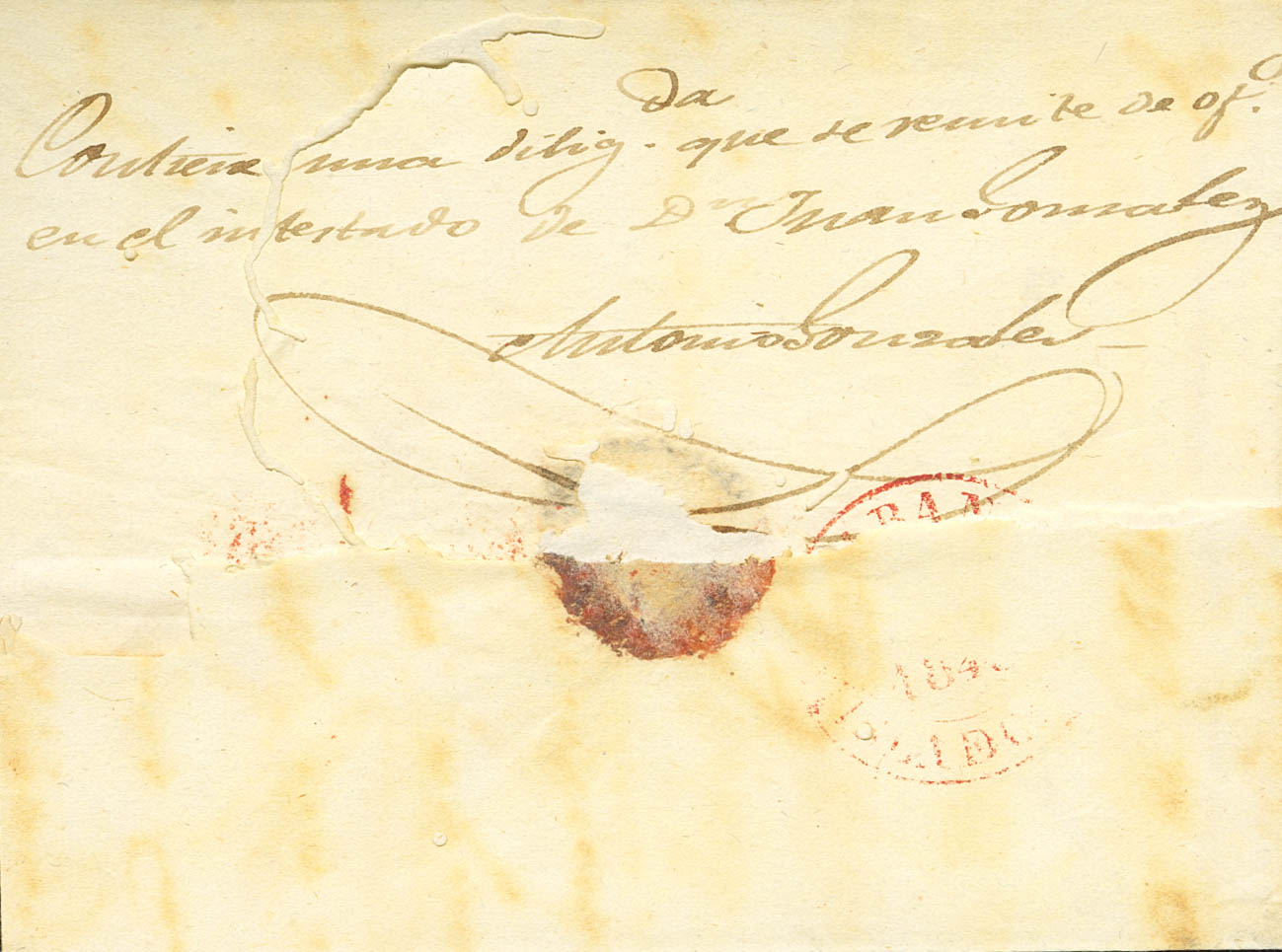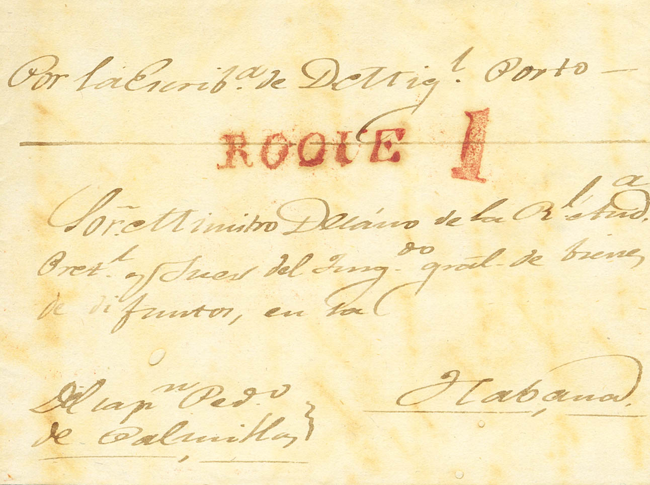 1843. PALMILLAS a LA HABANA. Marca ROQUE, en rojo aplicada en tránsito. MAGNIFICA Y EXTRAORDINARIAMENTE RARA, NO RESEÑADA EN LA OBRA DE TIZON.