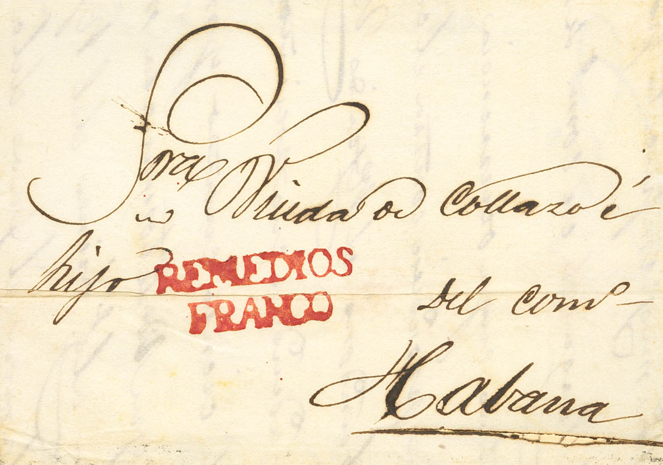 1838. SAN JUAN DE LOS REMEDIOS a LA HABANA. Marcas REMEDIOS y FRANCO (P.E.3 y P.E.6). MAGNIFICA Y RARA.