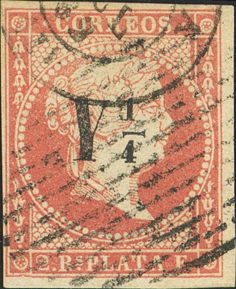 10. 1860. Y¼ real sobre 2 reales rojo. MAGNIFICO. Cert. ECHENAGUSIA. Edifil 2025: 150 Euros