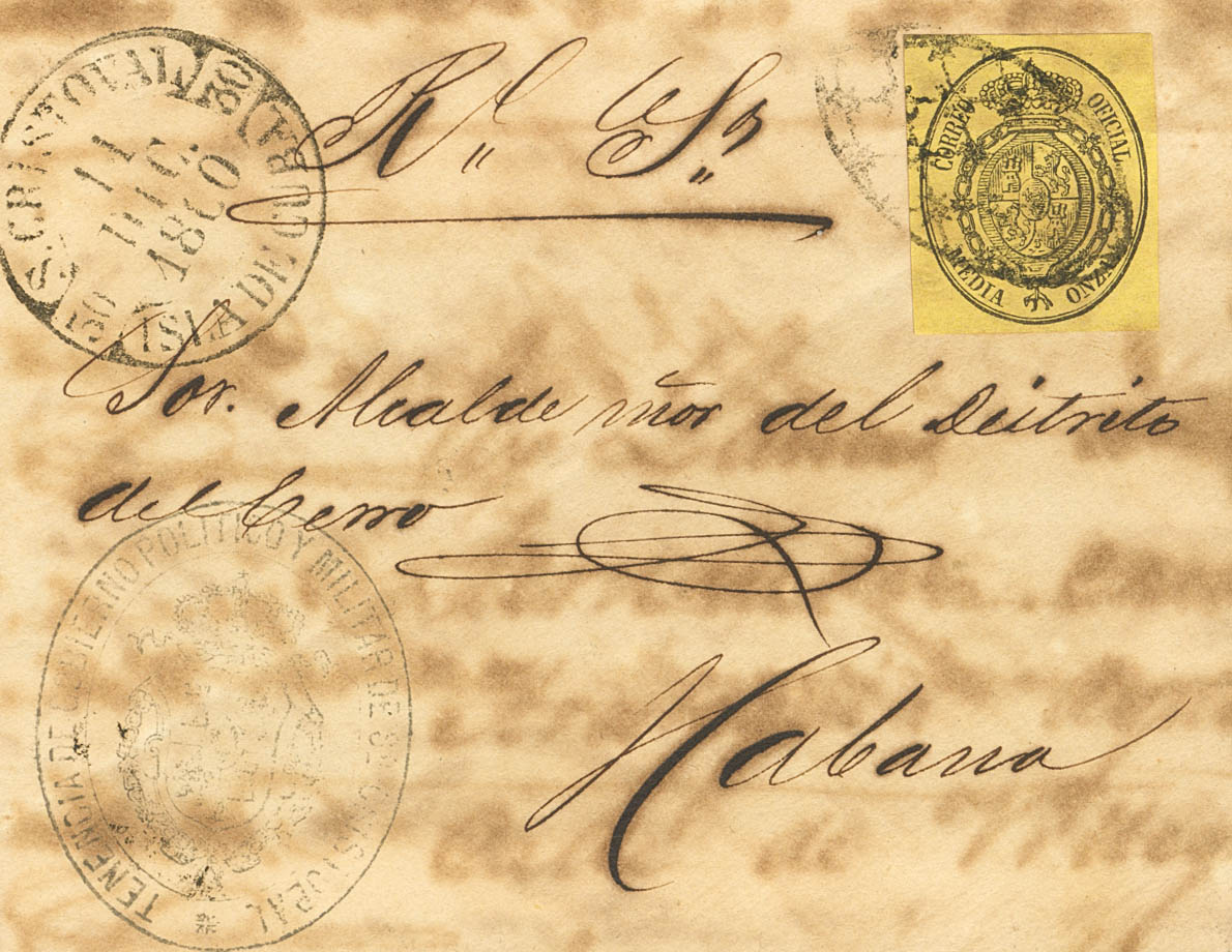 1860. ½ onza negro sobre amarillo. Frontal de SAN CRISTOBAL a LA HABANA. En el frente baeza S.CRSITOVAL / ISLA DE CUBA, en negro. MAGNIFICA Y RARA.