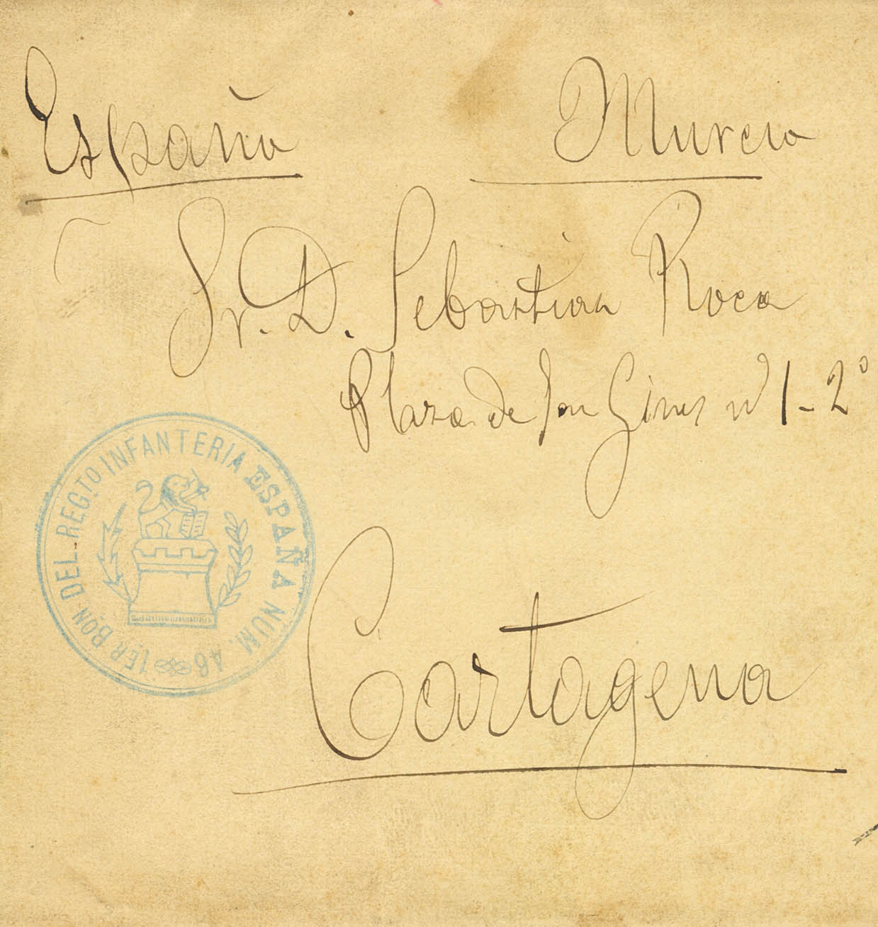 (1895ca). ISLA DE CUBA a CARTAGENA (MURCIA). En el frente marca militar 1º BON DEL REGTº INFANTERIA ESPAÑA Nº46, en azul, este regimiento de infantería tenía su centro en Cartagena (cuando comenzo la Guerra de Cuba), al dorso llegada. MAGNIFICA E INTERESANTE DOCUMENTO HISTORICO DE LA GUERRA DE INDEPENDENCIA CUBANA, DE AQUI SALIERON LOS PRIMEROS BATALLONES HACIA CUBA.
