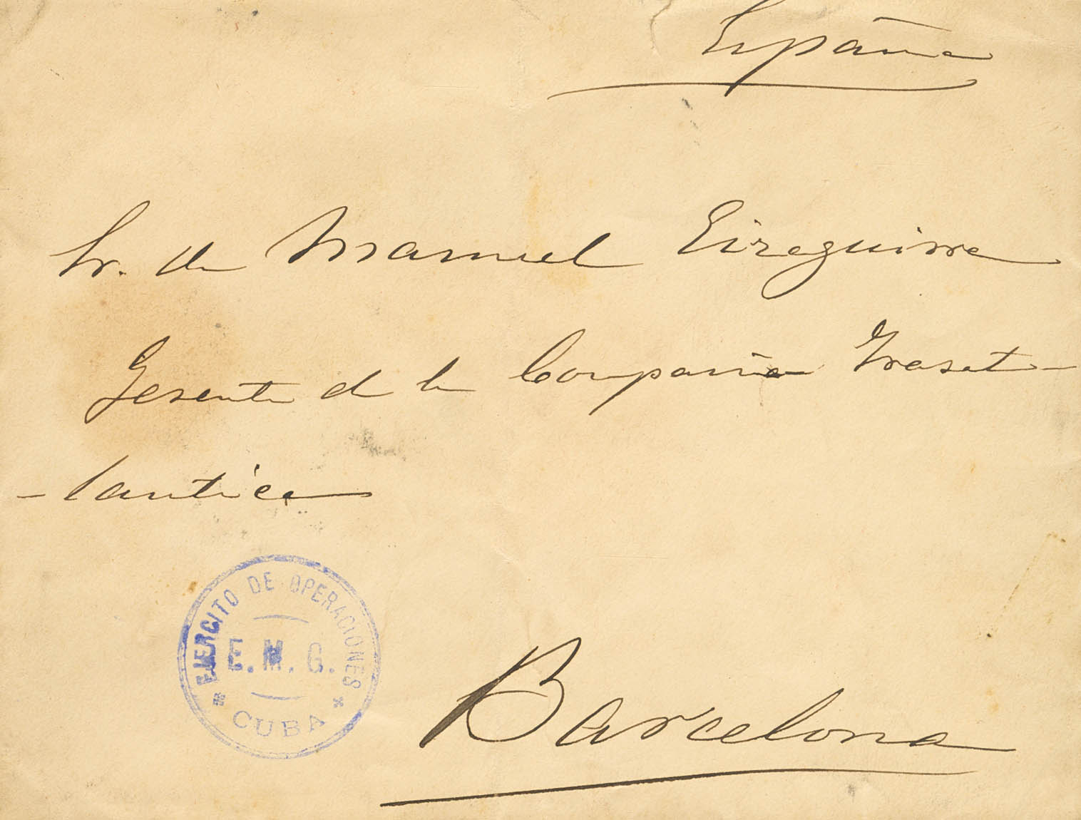 1896. CUBA a BARCELONA (Compañía Trasatlántica). En el frente marca militar EJERCITO DE OPERACIONES / E.M.G. / CUBA, al dorso llegada. MAGNIFICA E INTERESANTE.