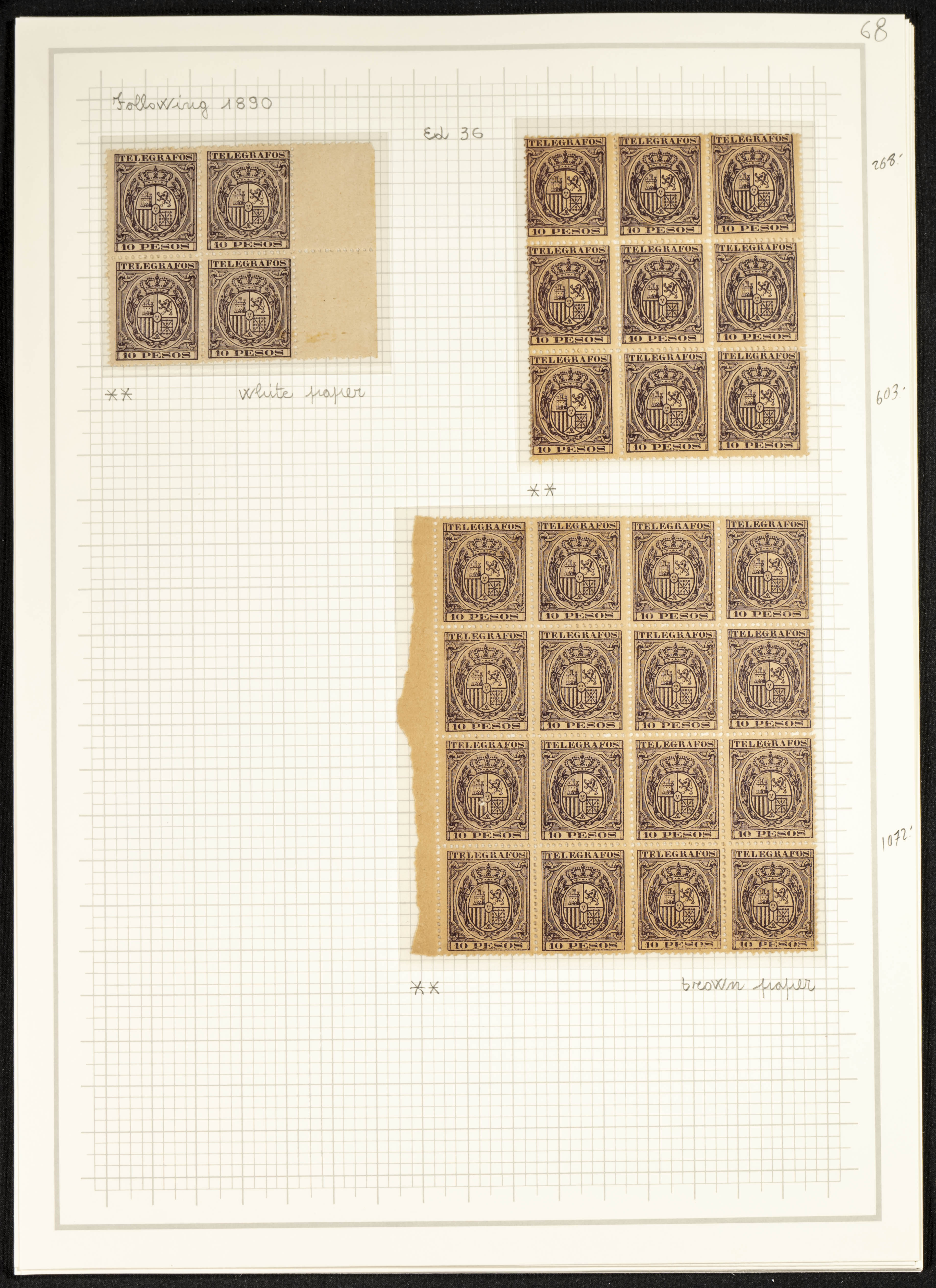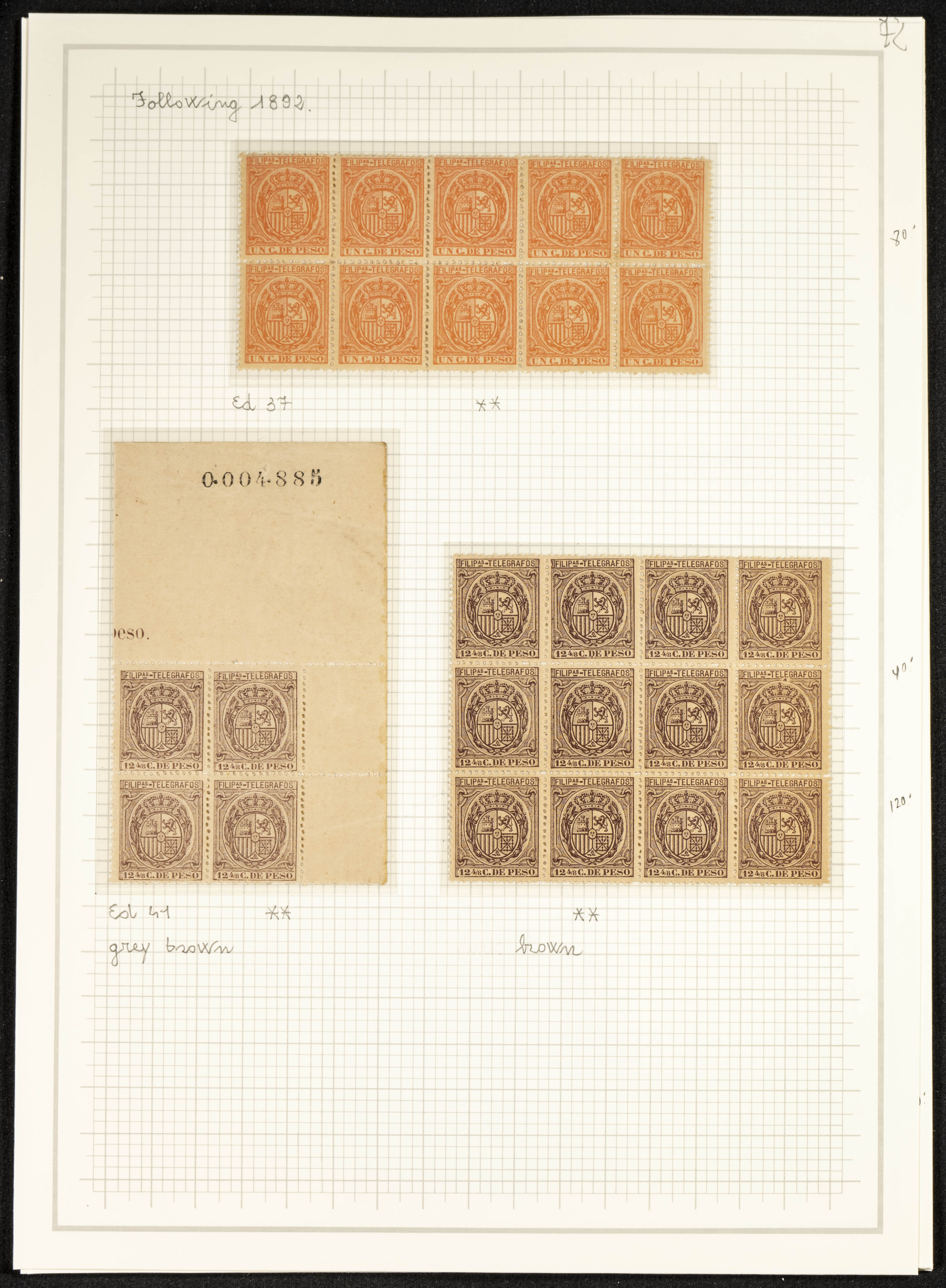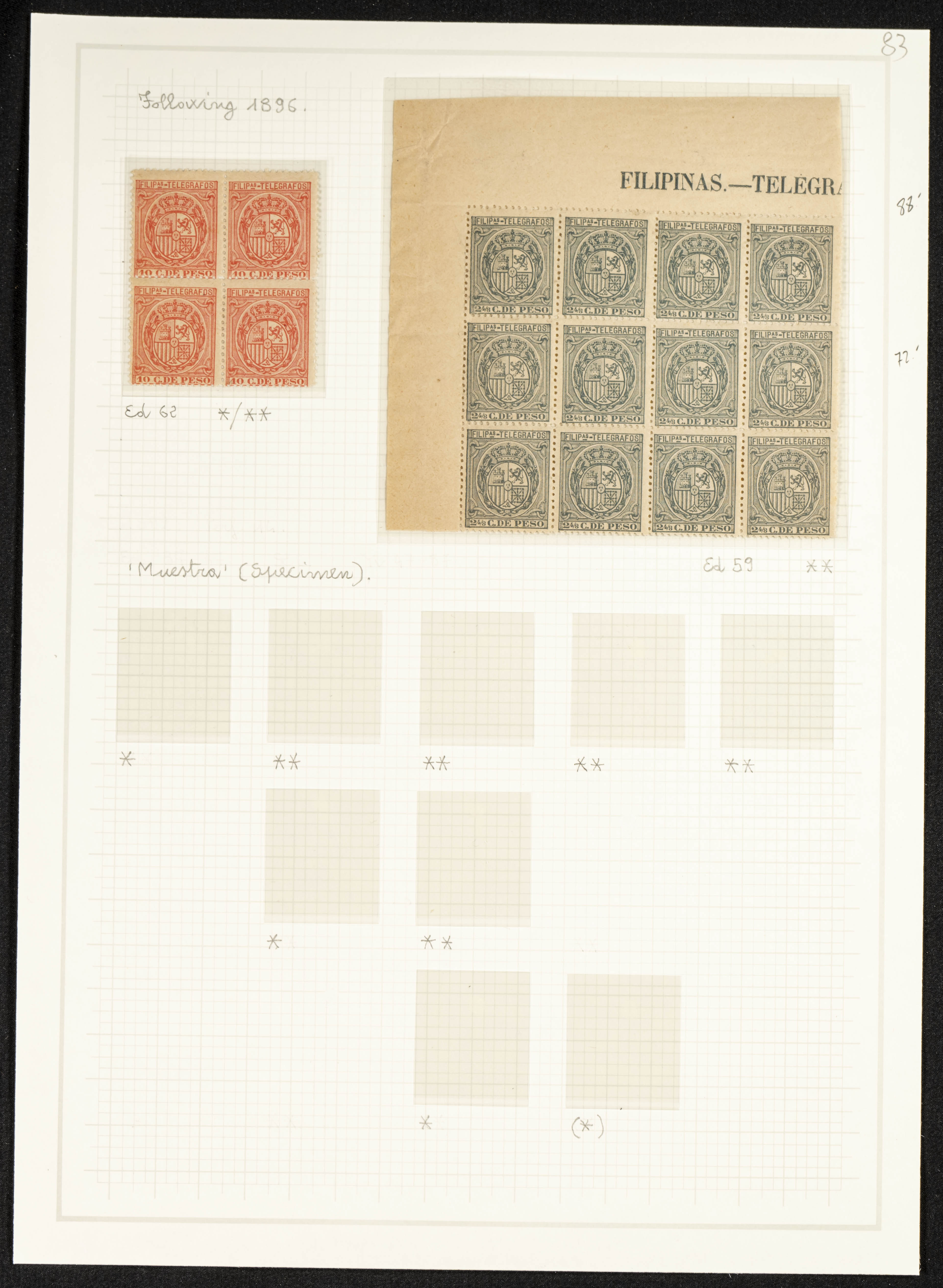 ★★/★1890. Interesante conjunto de sellos sueltos de Telégrafos de Filipinas entre 1890 y 1896, en nuevo y la mayoría sin fijasellos e incluyendo algún valor clave, incluyendo bloques de diversos tamaños. A EXAMINAR. Edifil 2018: 7.243 Euros