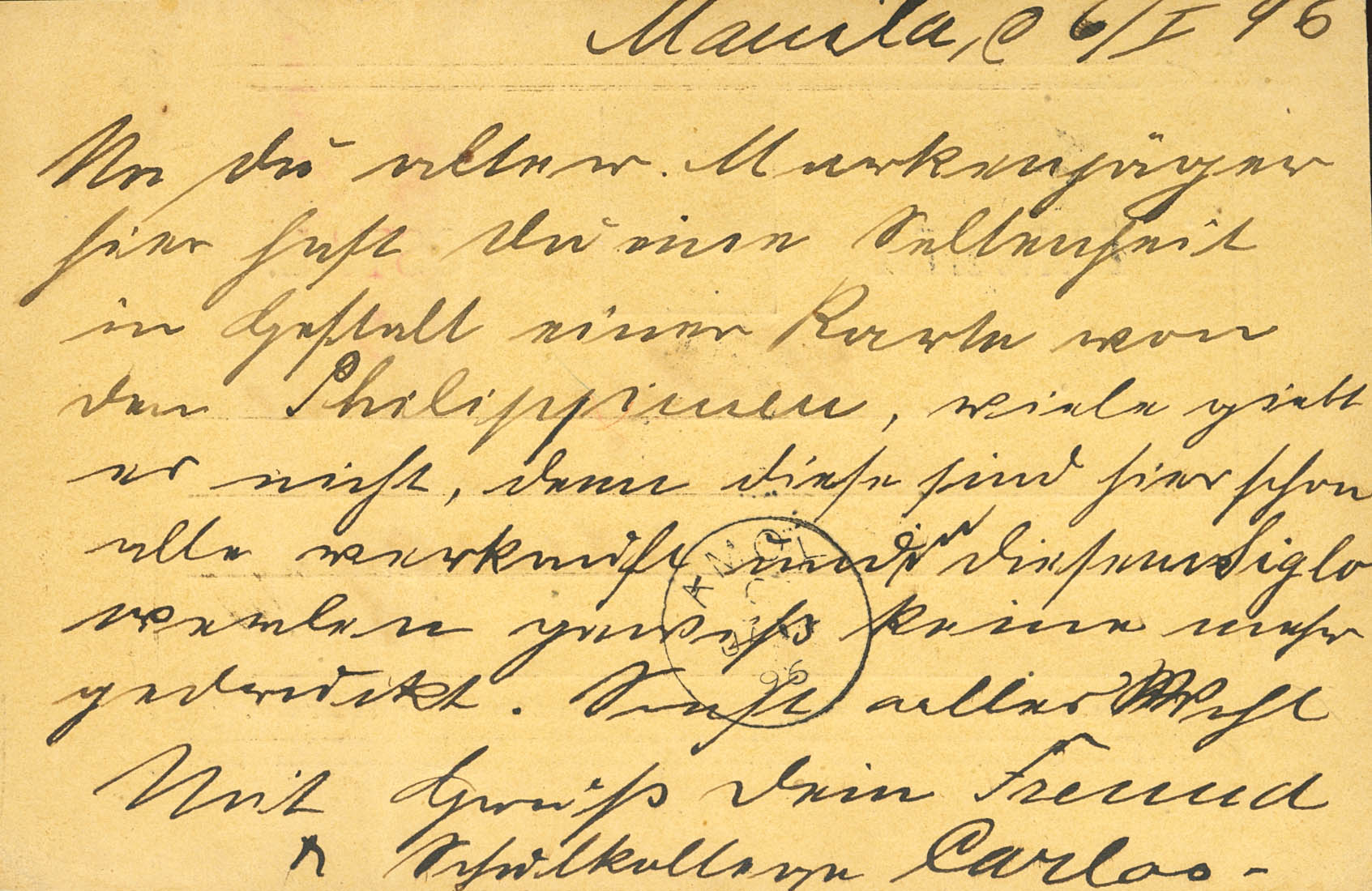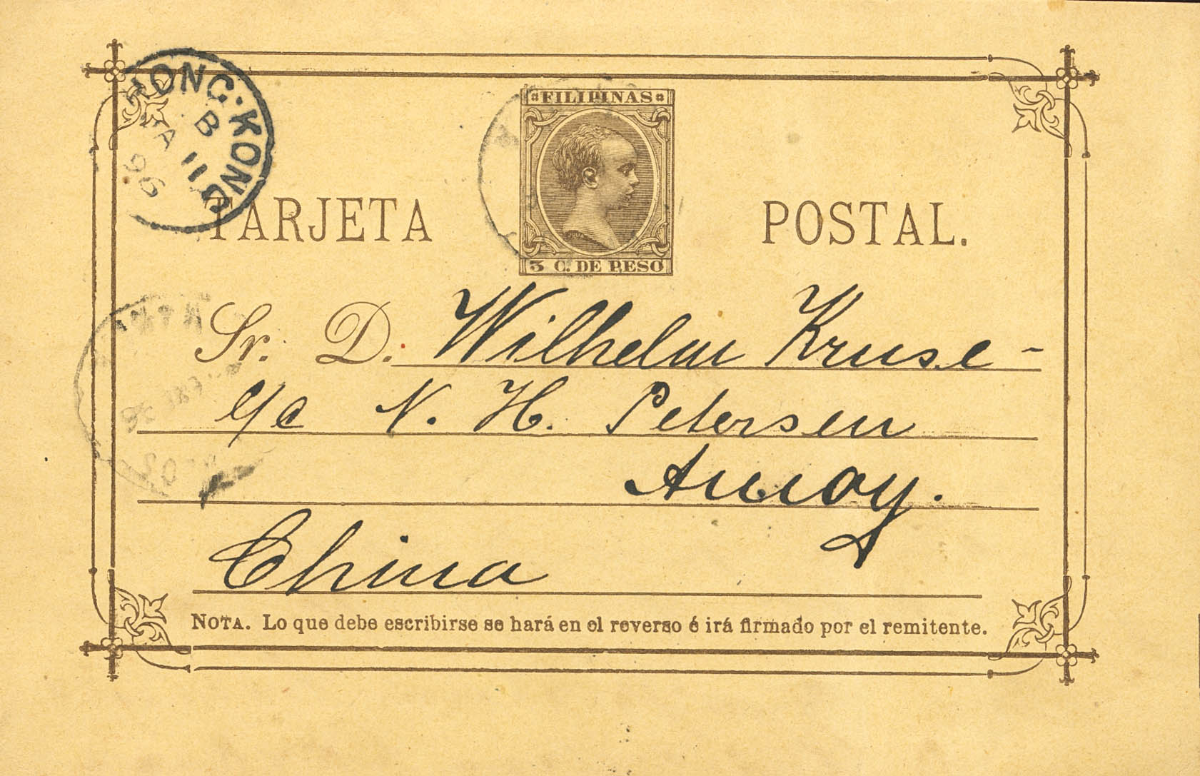 EP11. 1896. 3 ctvos castaño sobre Tarjera Entero Postal de MANILA (FILIPINAS) a AWAY (CHINA). En el frente y al dorso tránsitos. MAGNIFICA Y MUY RARA, EN LA OBRA DE ENTEROS POSTALES DE LAIZ SOLO HACE REFERENCIA A TRES DESTINOS A ASIA, UNO A JAPON, UNO A CHINA Y UNO A TAILANDIA, ESTE SERIA EL SEGUNDO DESTINO QUE CONOCEMOS A CHINA.