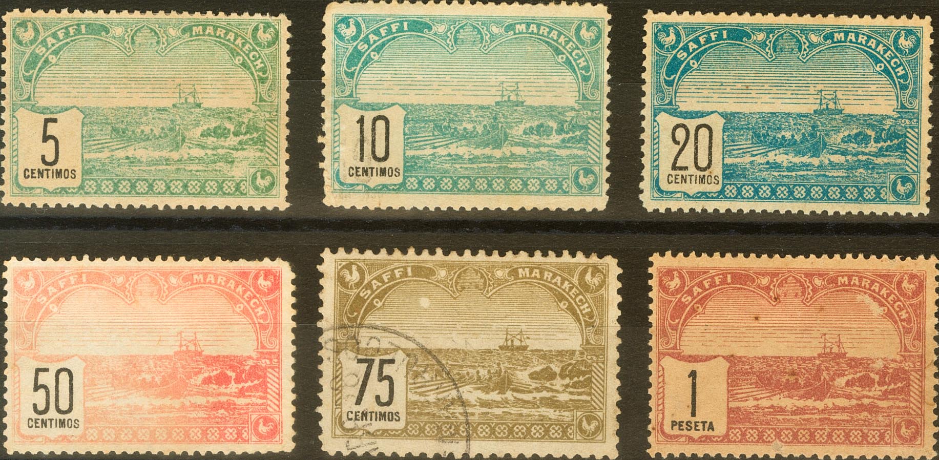 (★)/1899. Serie completa, a falta del 25 cts violeta (75 cts en usado). SAFFI-MARRAKECH. BONITA Y RARA. (Yvert 98/04)