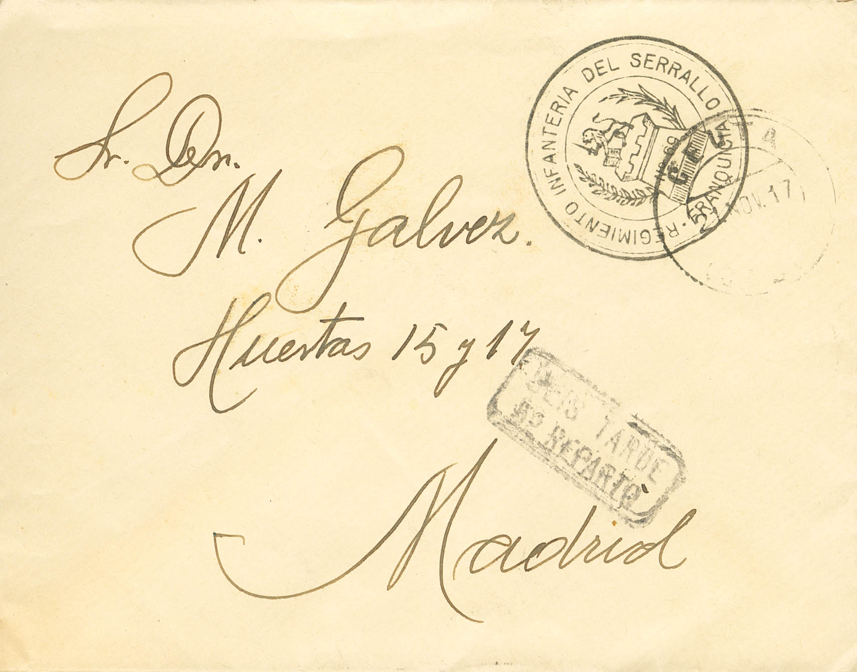 1917. CEUTA a MADRID. Marca de franquicia REGIMIENTO INFANTERIA DE SERRALLO / Nº60 / FRANQUICIA y al dorso llegada. MAGNIFICA Y RARA.