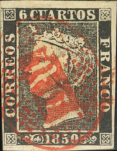 1. 1850. 6 cuartos negro. Matasello lacrador "R.O.". MAGNIFICO Y MUY RARO, PROBABLEMENTE SE TRATE DEL MAS BONITO DE TODOS LOS CONOCIDOS. Cert. CEM y GRAUS. (este lacrador siempre ha sido descrito con las letras "D.N." en su interior, debido a la nitidez que presenta esta pieza podemos asegurar que se tratan de las letras "R.O.").