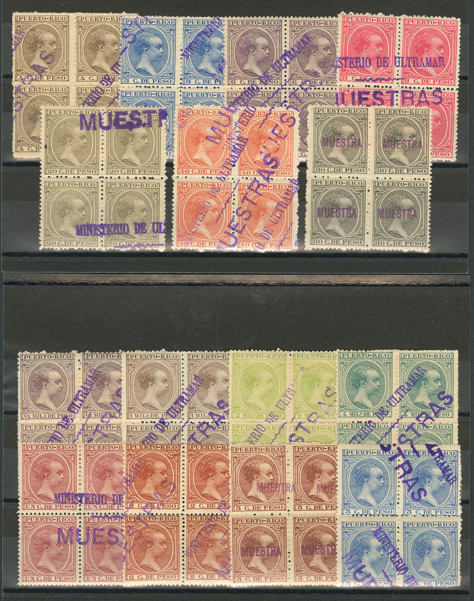 ★★/★ 115/29M(4). 1896. Serie completa, bloque de cuatro (algunos desprendidos y reforzados con papel, sin importancia alguna). Sobrecargas MUESTRA (3 ctvos y 80 ctvos) y MUESTRAS / MINISTERIO DE ULTRAMAR, en violeta. MAGNIFICA Y RARISIMA. Edifil 2019: +1.800 Euros