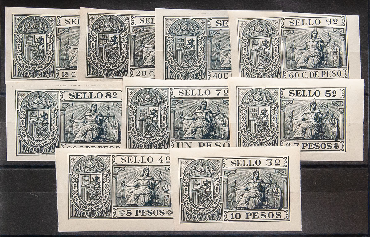 ★1898. 15 cts, 20 cts, 40 cts, 60 cts, 80 cts, 1 peso, 3 pesos, 5 pesos y 10 pesos negro. POLIZAS. MAGNIFICAS.
