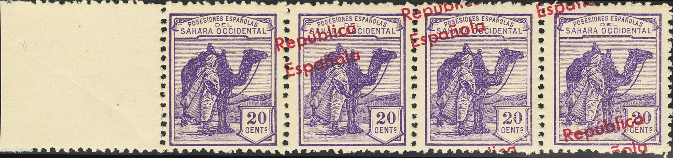 ★★ 39Bhdx(4). 1932. 20 cts violeta, tira de cuatro. SOBRECARGA DESPLAZADA EN DIAGONAL. MAGNIFICA Y RARA. Edifil 2018: 300 Euros