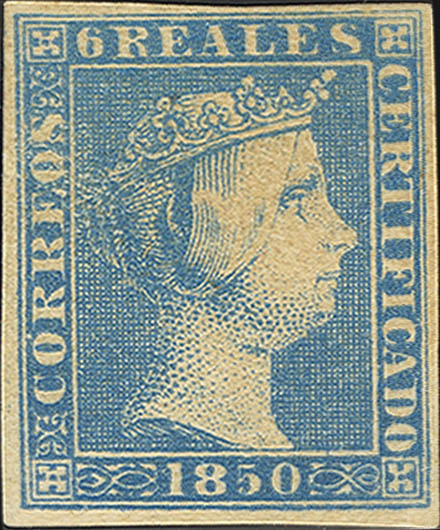 (★) 4. 1850. 6 reales azul (manchita visible a la lámpara, aun así apariencia de sello nuevo). MAGNIFICO.