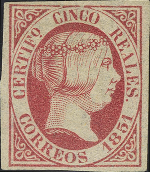(★) 9. 1851. 5 reales rojo. Márgenes grandes y color nítido. PIEZA DE LUJO. Cert. COMEX.
