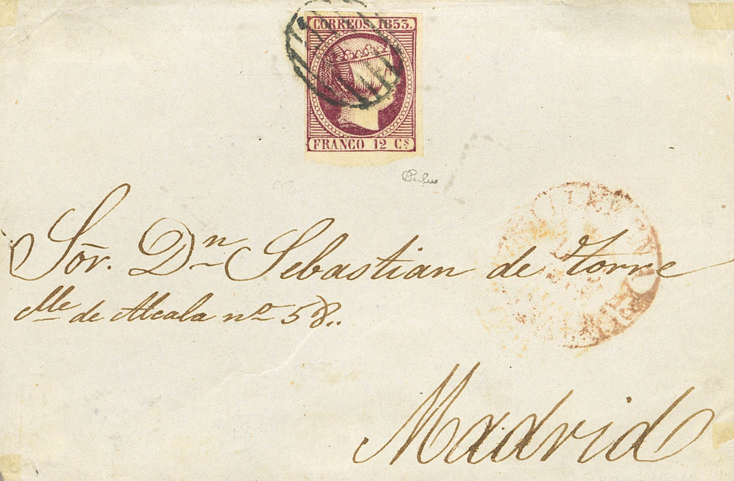 18. 1853. 12 cuartos violeta, borde de hoja. Frontal de LLERENA a MADRID. MAGNIFICA.