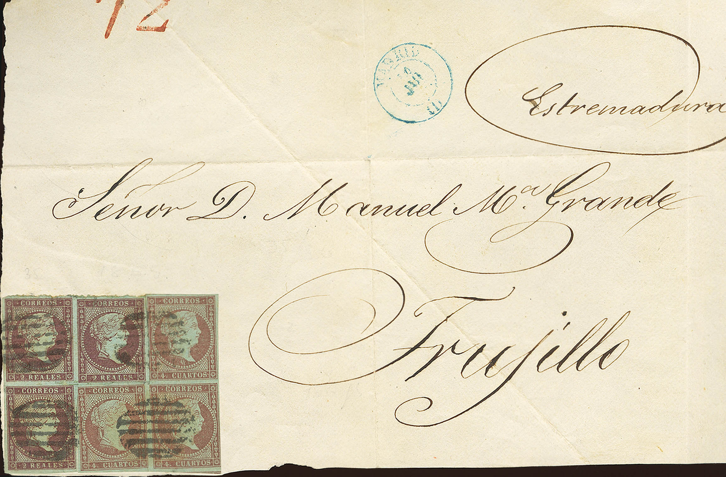 40(3), 42(3). (1855ca). 4 cuartos carmín, tres sellos y 2 reales violeta, tres sellos. Frontal de MADRID a TRUJILLO. En el frente fechador MADRID / (1) y porte "72" (cuartos). MAGNIFICO Y RARO FRANQUEO DE QUINCE PORTES.