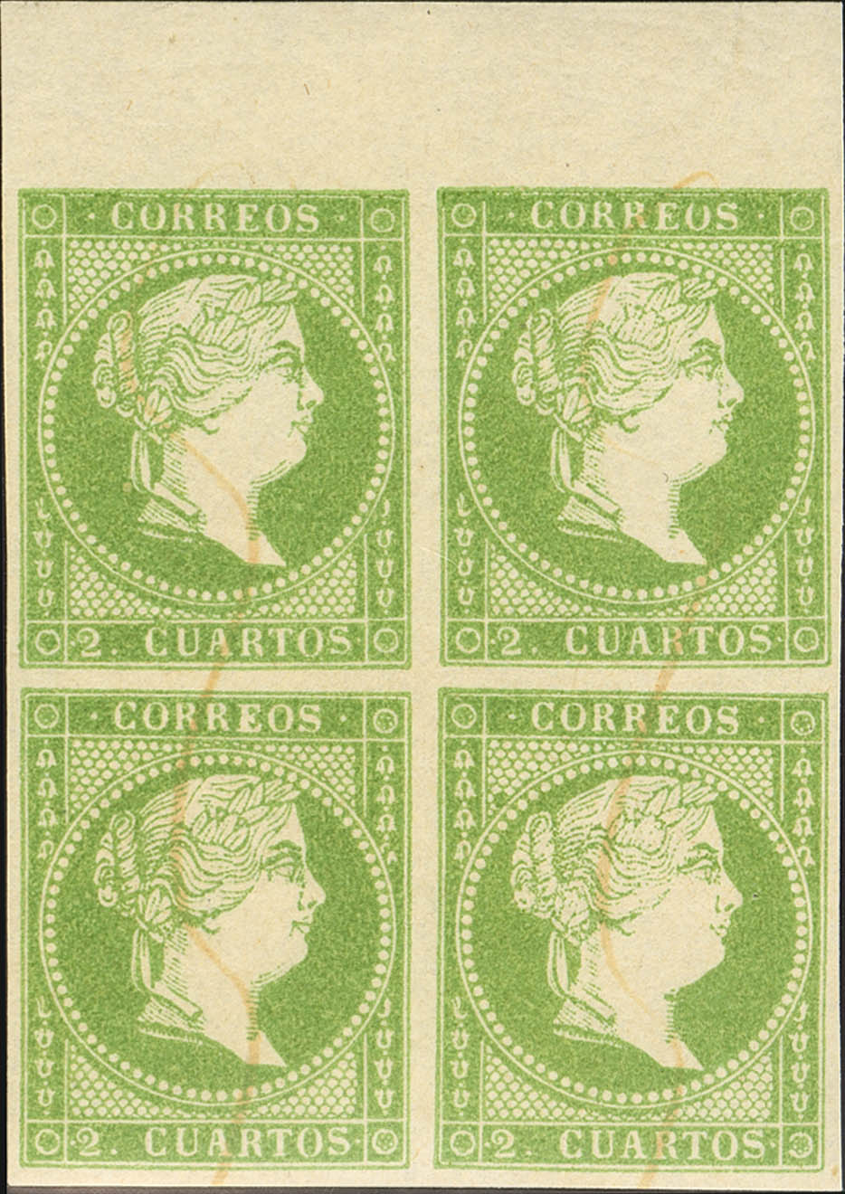 47(4). 1855. 2 cuartos verde, bloque de cuatro, borde de hoja. Inutilizado a pluma. MAGNIFICO. Edifil 2020: 1.275 Euros