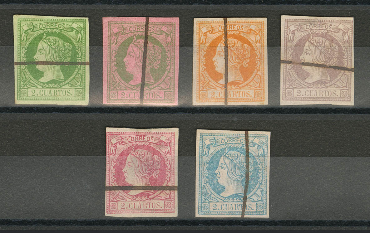 51P(6). 1860. Conjunto de seis ENSAYOS DE COLOR del 2 cuartos con inutilización a pluma. MAGNIFICO Y RARO CONJUNTO. (Gálvez 247/50, 253, 255)