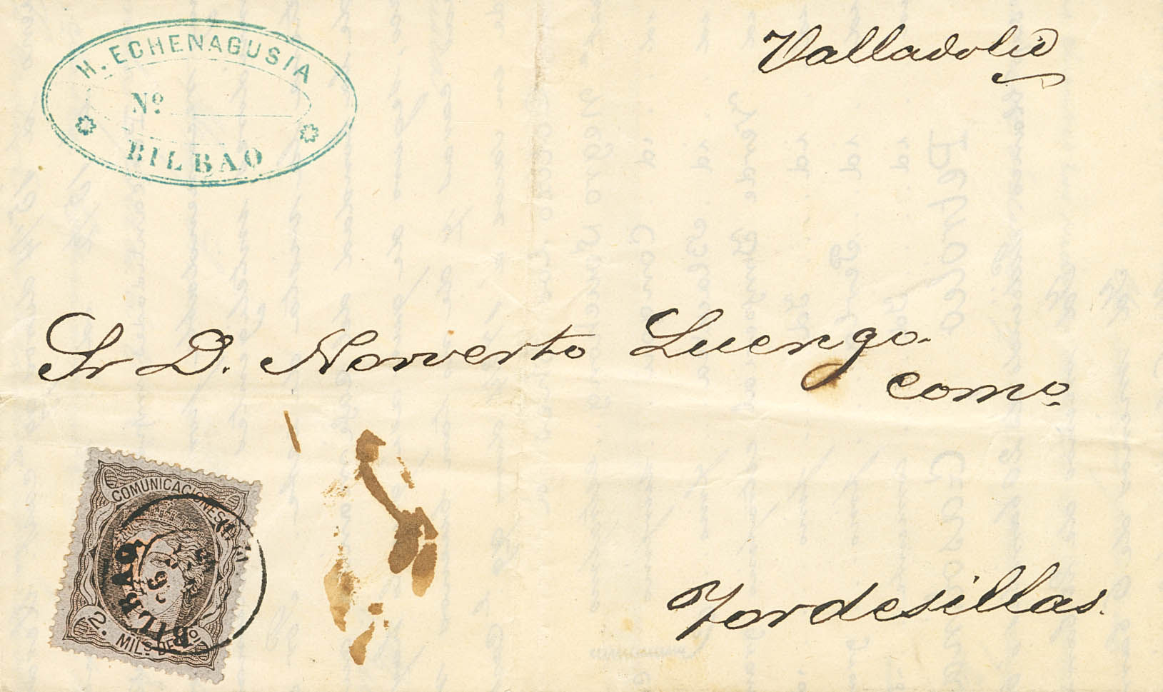 103. 1870. 2 mils negro sobre gris. BILBAO a TORDESILLAS (VALLADOLID). Matasello BILBAO / (20). MAGNIFICA Y RARO FRANQUEO DE DOBLE PORTE DE IMPRESOS.