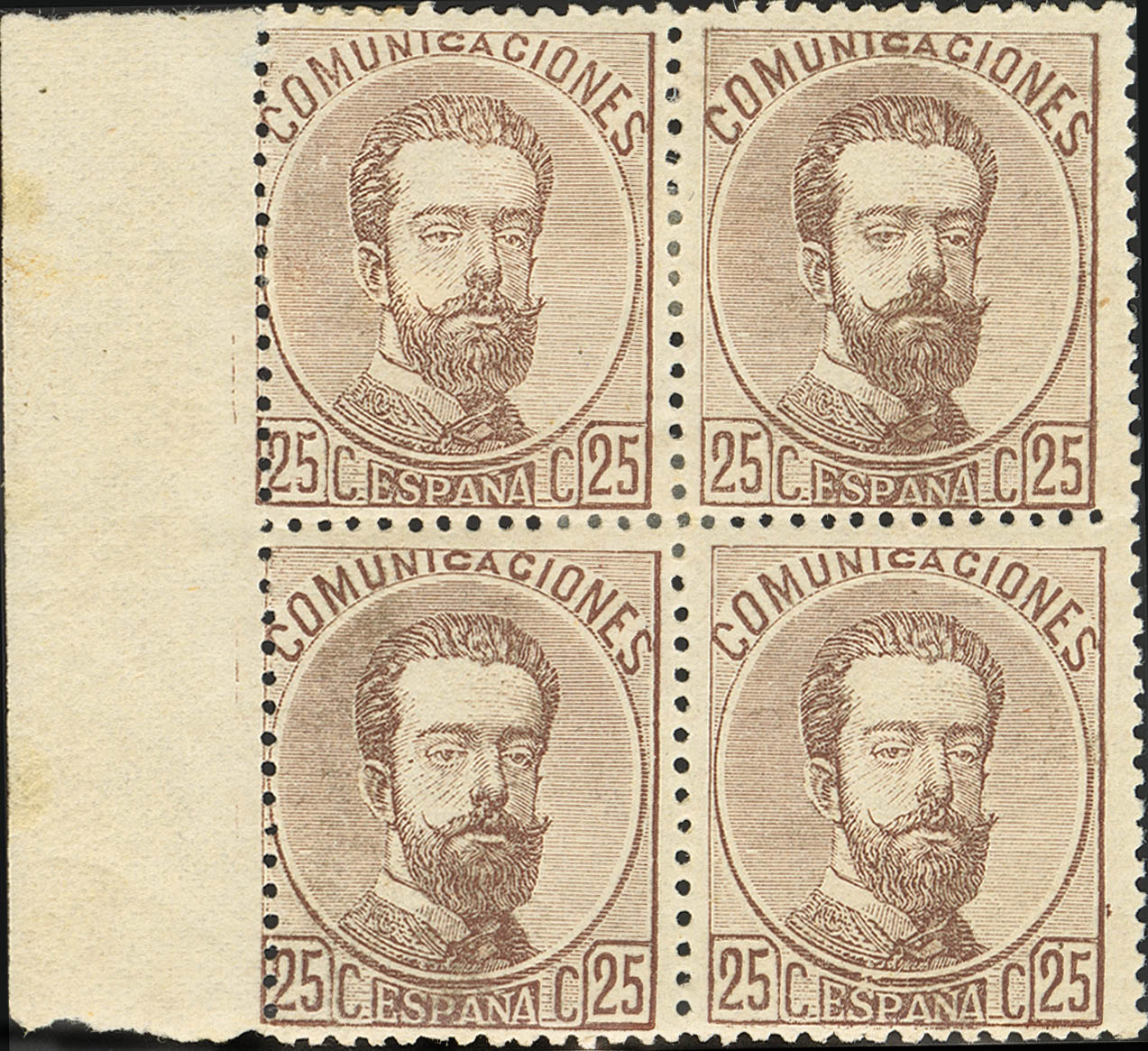★★/★ 124(4). 1872. 25 cts castaño, bloque de cuatro, borde de hoja. MAGNIFICO. Edifil 2020: +275 Euros