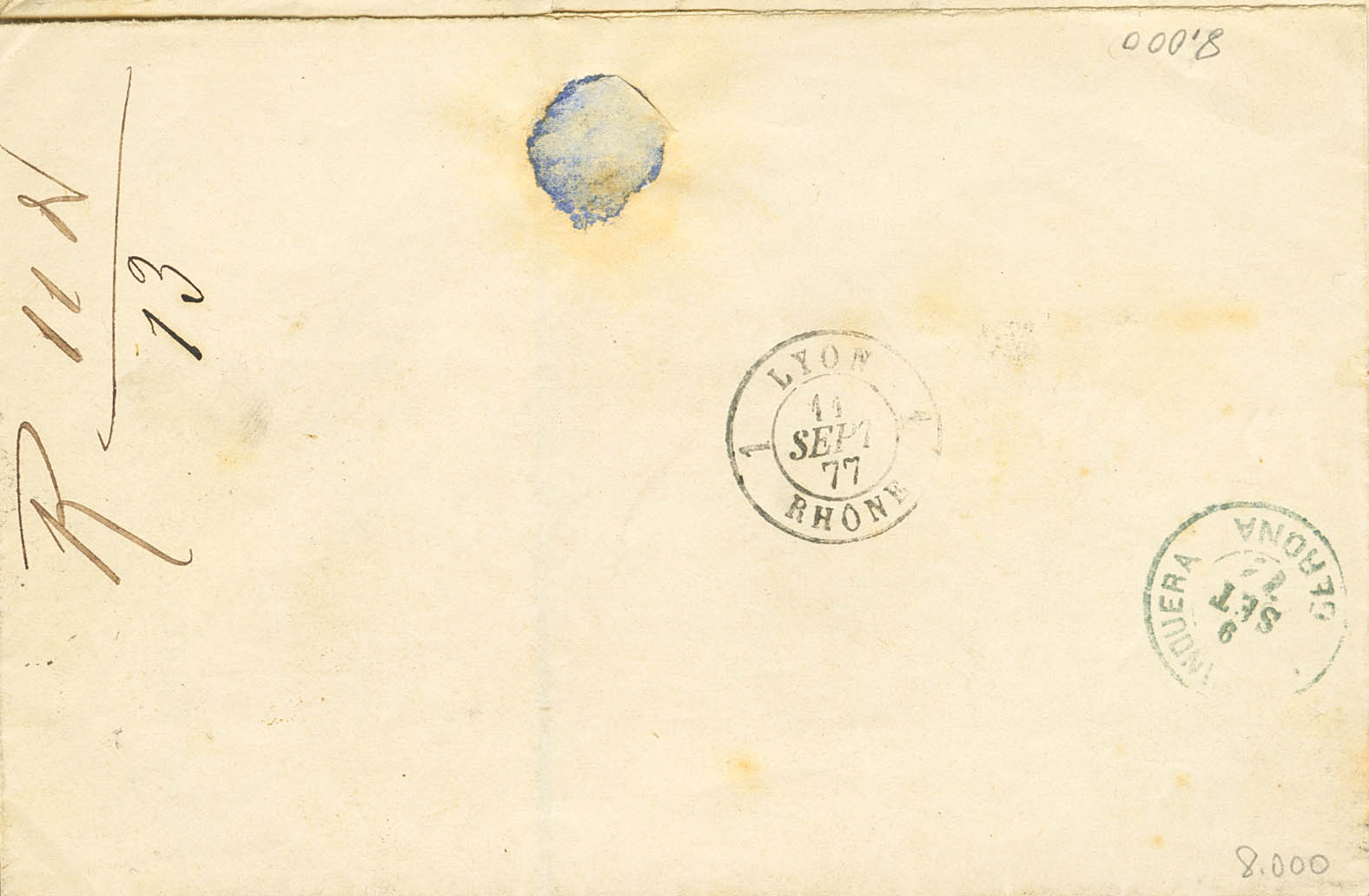 174, 176. 1877. 5 cts sepia y 20 cts verde bronce. SEGORBE a LYON (FRANCIA). MAGNIFICA E INUSUAL USO DEL 20 CTS VERDE BRONCE.