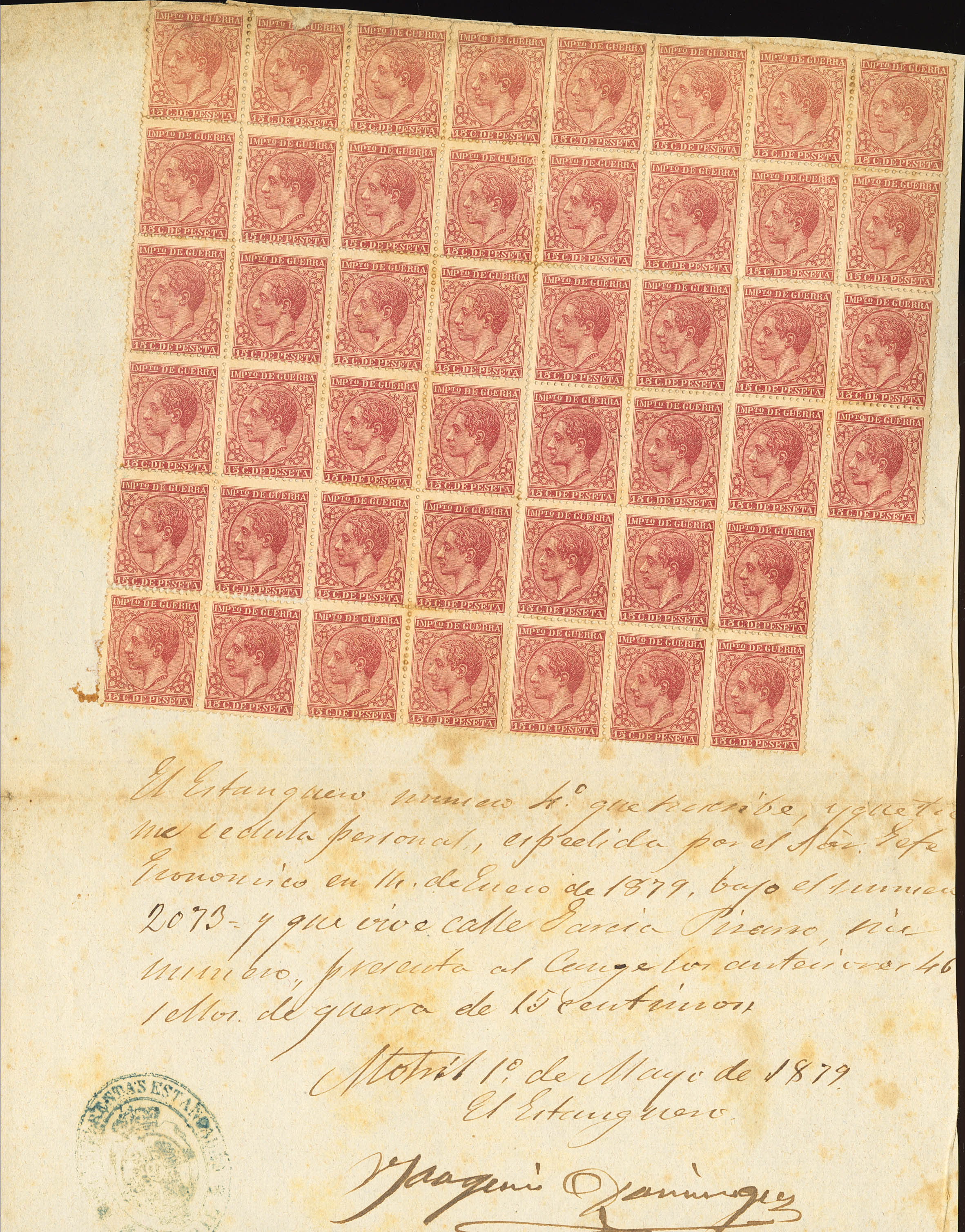 188(46). 1879. 15 cts carmín, cuarenta y seis sellos, sobre documento de canje fechado en MOTRIL (GRANADA). MAGNIFICO Y RARO.