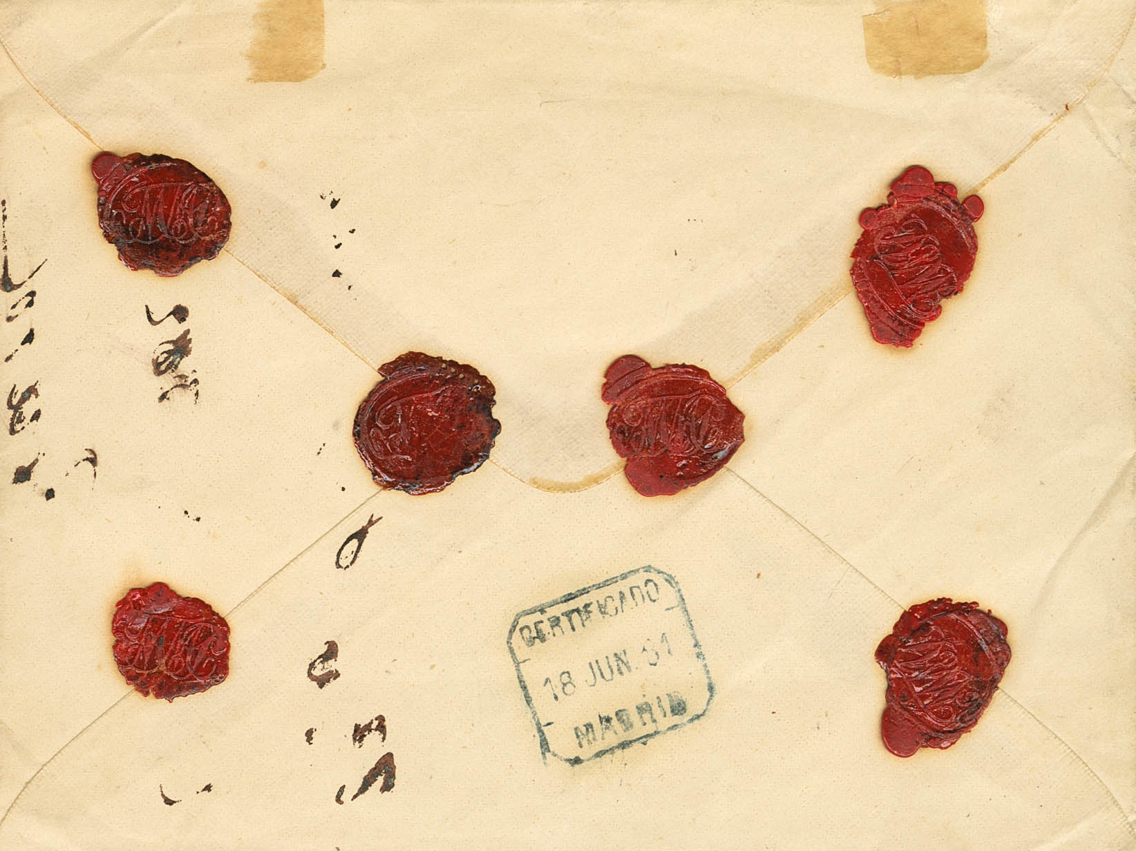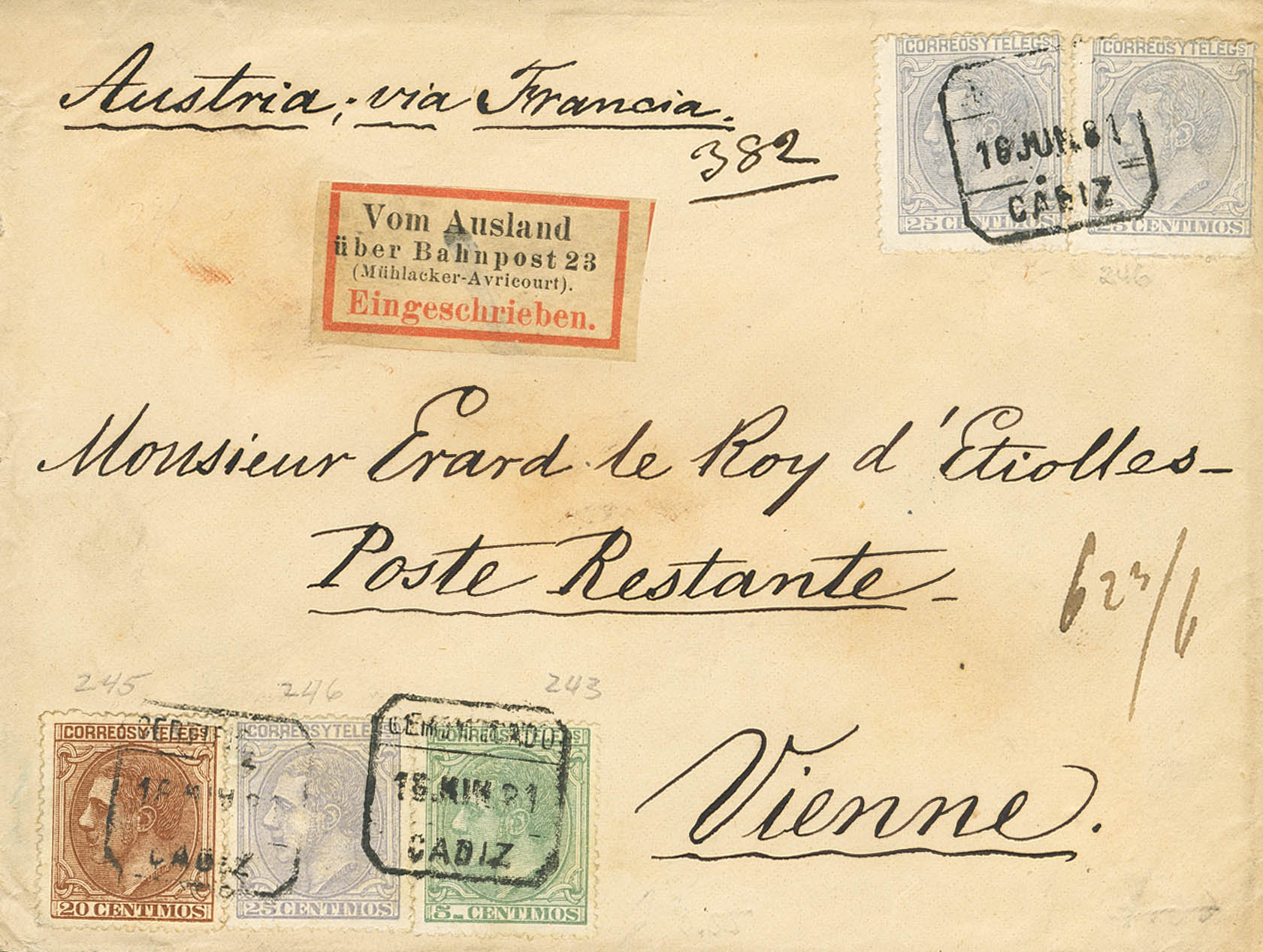201, 203, 204(3). 1881. 5 cts verde, 20 cts castaño y 25 cts gris, tres sellos. Certificado de CADIZ a VIENA (AUSTRIA). MAGNIFICA Y RARISIMA, INUSUAL DESTINO Y PIEZA DE ENORME BELLEZA.