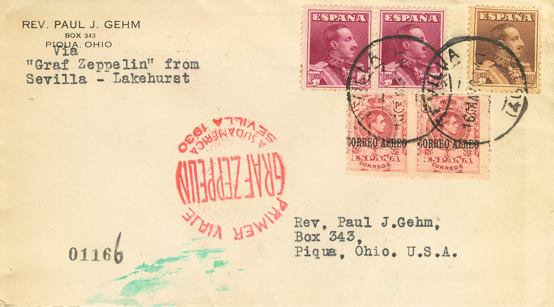 322(2), 323, 296(2). 1930. 1 pts carmín, pareja, 4 pts carmín, pareja y 10 pts castaño. Graf Zeppelin de SEVILLA a PIQUA (U.S.A.). Al dorso llegada. MAGNIFICA.