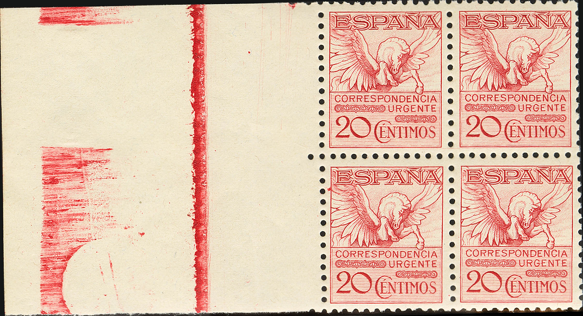 ★★ 592A(4). 1931. 20 cts rosa, bloque de cuatro, borde de hoja. Excelente centraje. MAGNIFICO. Edifil 2025: ++520 Euros