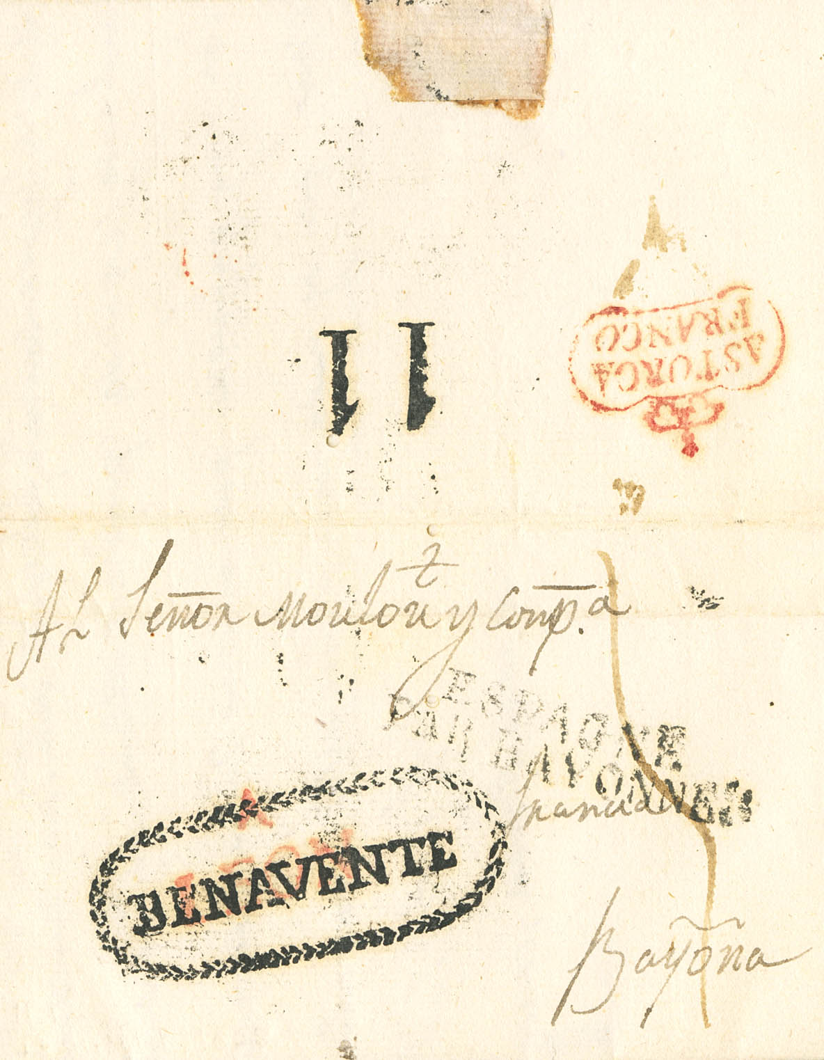 1825. ASTORGA a BAYONA (FRANCIA). Marca A. / LEON, en rojo (P.E.5) edición 2004 y al dorso marca ASTORGA / FRANCO (P.E.7), la franquicia no es aceptada debido a que la carta está dirigida al extranjero y en Benavente se aplica la marca BENAVENTE, en negro (P.E.7) y se portea convenientemente con "11" (cuartos). MAGNIFICA Y EXTRAORDINARIAMENTE RARA, POSIBLEMENTE UNICA.