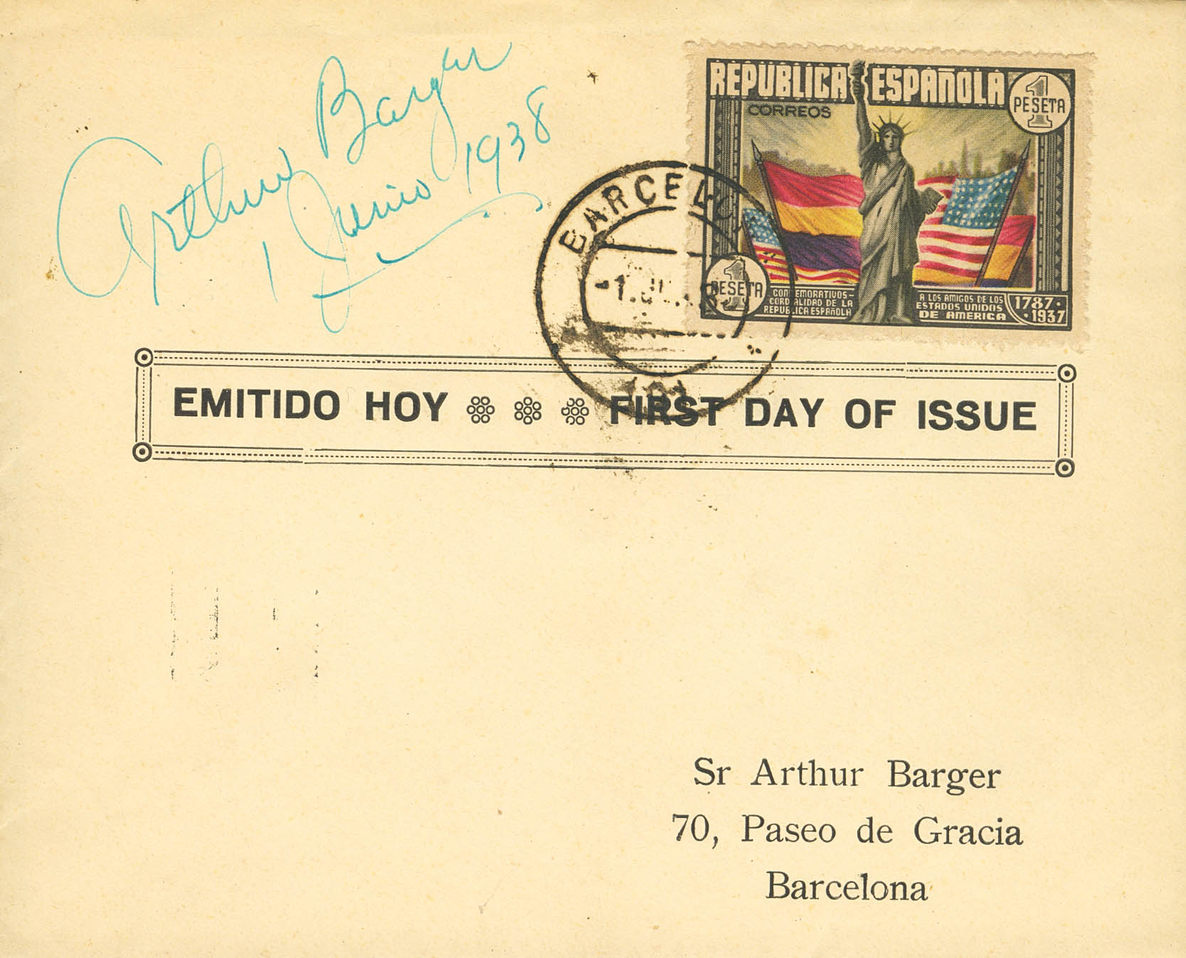 763. 1938. 1 pts multicolor. Sobre de Primer Día dirigida a BARCELONA. Firmada por Arthur Barguer. MAGNIFICA.