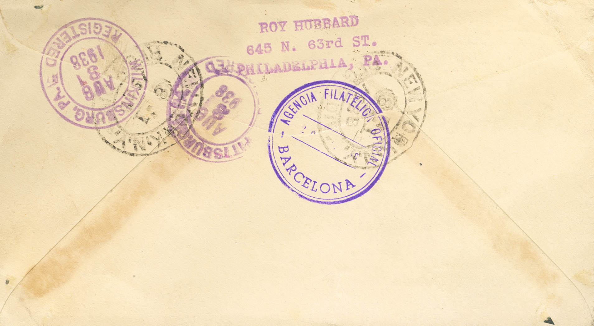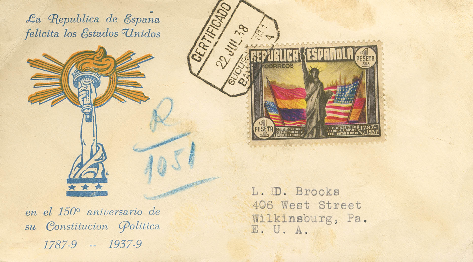 763. 1938. 1 pts multicolor. Certificado de BARCELONA a WILKINGSBURG (ESTADOS UNIDOS). Al dorso tránsitos y llegada. MAGNIFICA.