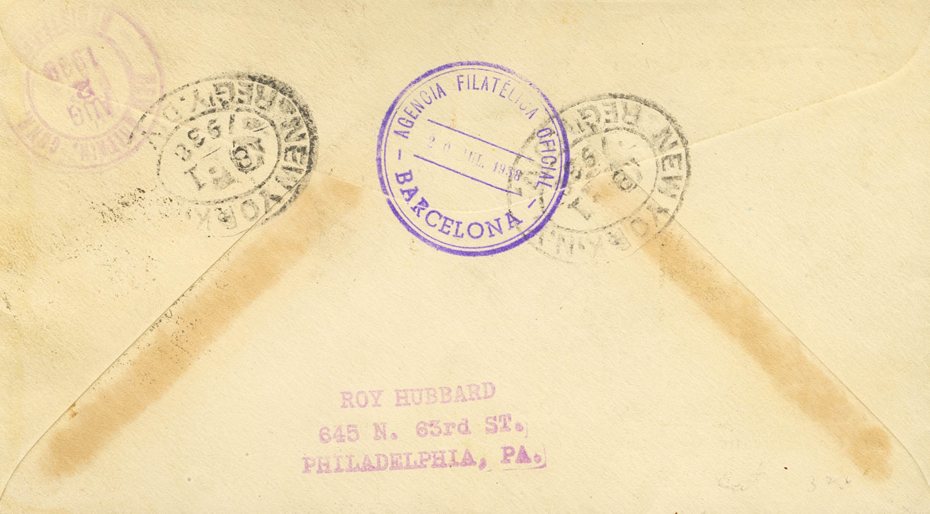 763(4). 1938. 1 pts multicolor, bloque de cuatro. Certificado de BARCELONA a NEW BRITAIN (ESTADOS UNIDOS). Al dorso tránsito y llegada. MAGNIFICA.