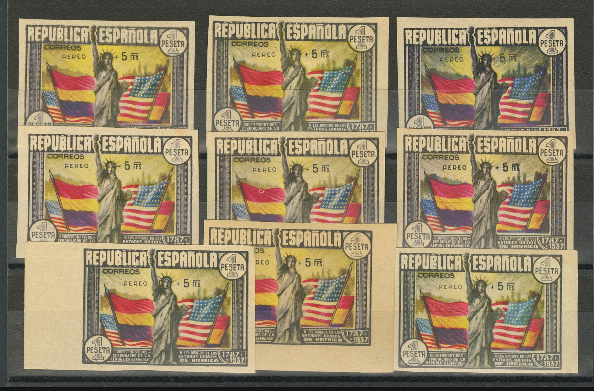 ★★/★ 765s(9). 1938. Conjunto de nueve sellos del 1 pts AEREO + 5 PTS SIN DENTAR de la emisión del Aniversario de la Constitución de los Estados Unidos, en diversas calidades, incluye cuatro certificados (3 de COMEX y uno de Esteban Paredes)(puede existir algún valor con la sobrecarga falsa, muchos de los ejemplares con marquilla al dorso, recordamos que se trata de un lote vendido sin derecho a reclamación). IMPRESCINDIBLE EXAMINAR.