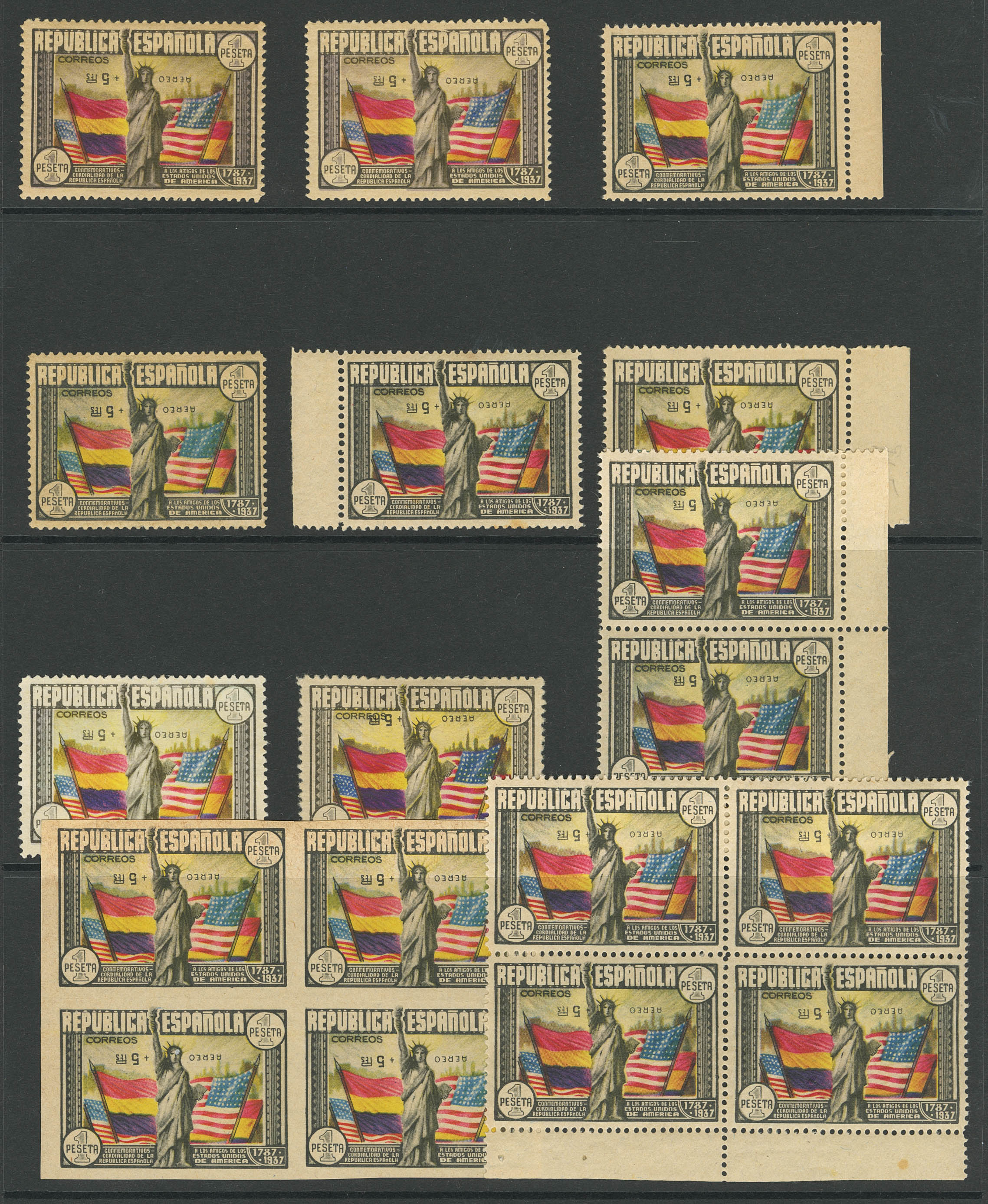 ★★/(★) 765hi(18). 1938. Conjunto de dieciocho sellos del 1 pts AEREO + 5 PTS SOBRECARGA INVERTIDA (dentado y sin dentar) de la emisión del Aniversario de la Constitución de los Estados Unidos, incluye dos certificados (COMEX y CMF)(puede existir algún valor con la sobrecarga falsa, muchos de los ejemplares con marquilla al dorso, recordamos que se trata de un lote vendido sin derecho a reclamación). IMPRESCINDIBLE EXAMINAR.