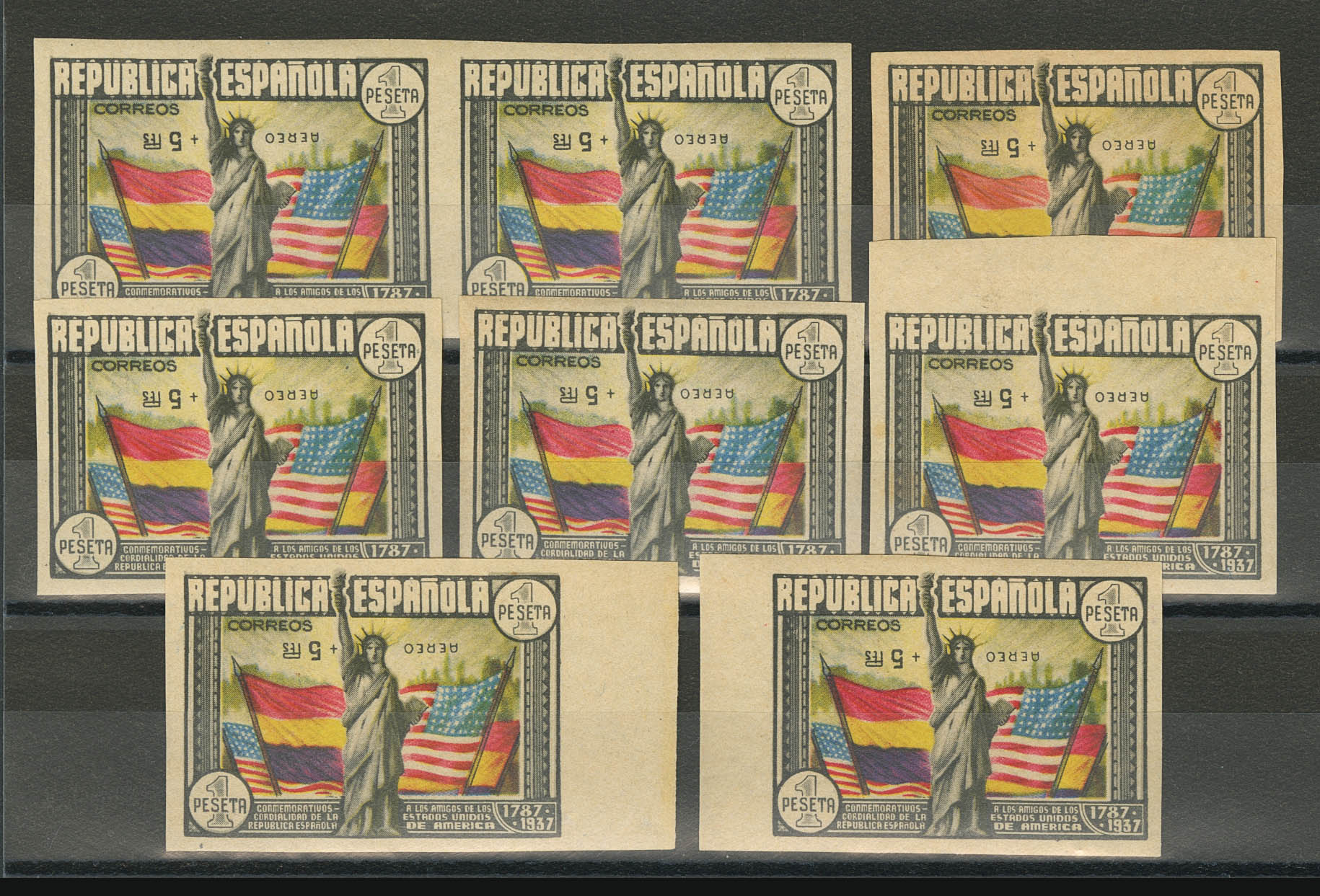 ★★/(★) 765his(8). 1938. Conjunto de ocho sellos del 1 pts AEREO + 5 PTS SOBRECARGA INVERTIDA y SIN DENTAR, en diversas calidades, de la emisión del Aniversario de la Constitución de los Estados Unidos, incluye un dictamen CEM y otro CMF (puede existir algún valor con la sobrecarga falsa, muchos de los ejemplares con marquilla al dorso, recordamos que se trata de un lote vendido sin derecho a reclamación). IMPRESCINDIBLE EXAMINAR.. IMPRESCINDIBLE EXAMINAR.