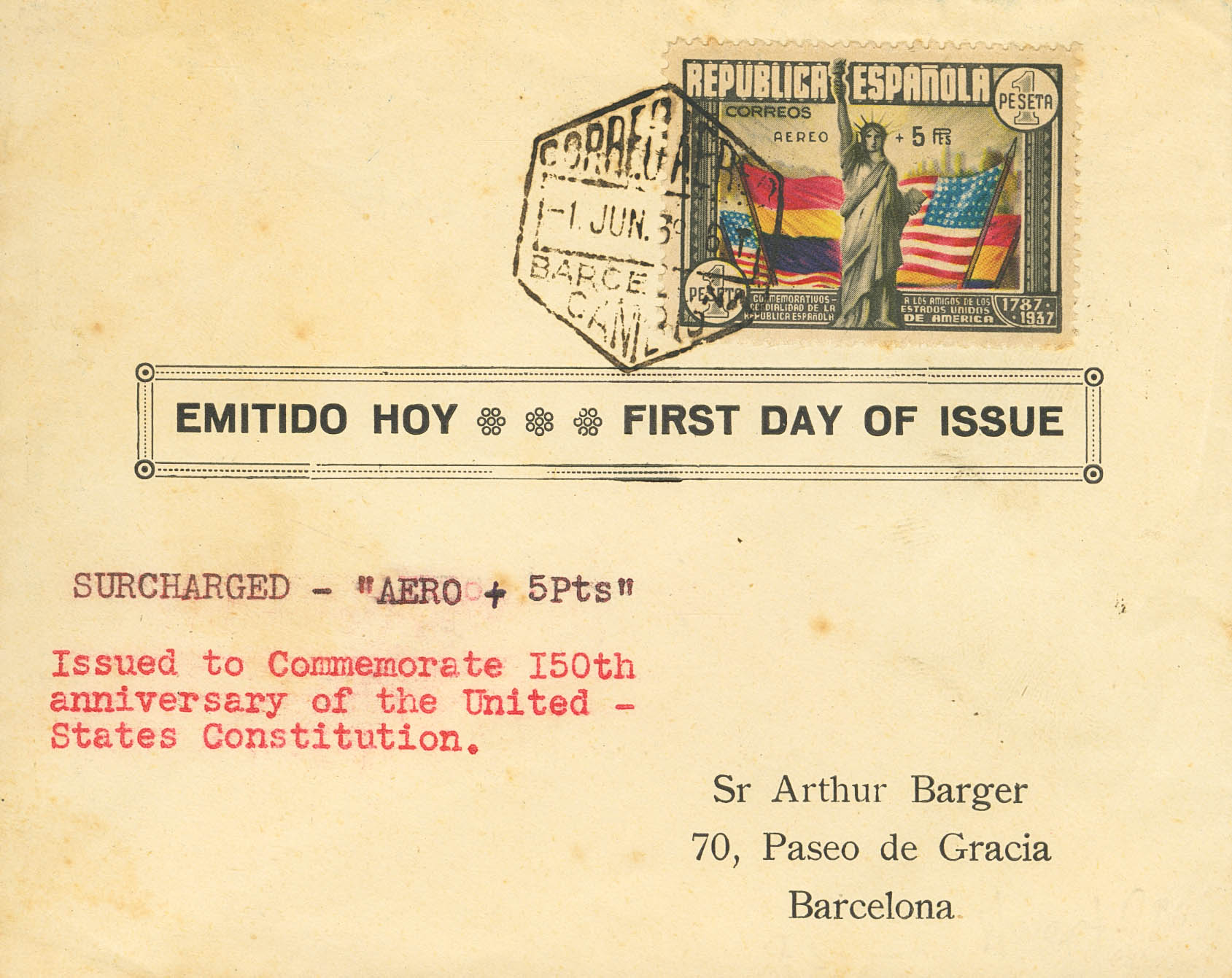 765. 1938. AEREO+5 PTS. Sobre de Primer Día dirigido a BARCELONA. MAGNIFICA.