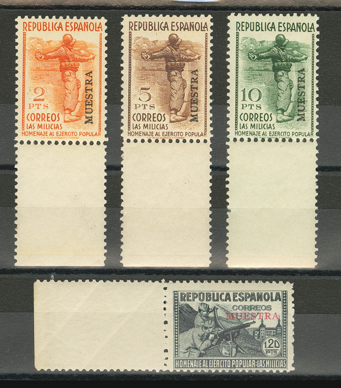 ★★ 797/00M. 1938. 1´20 pts negro, 2 pts naranja, 5 pts castaño y 10 pts verde, bordes de hoja. MUESTRA. MAGNIFICOS. Edifil 2020: +763 Euros