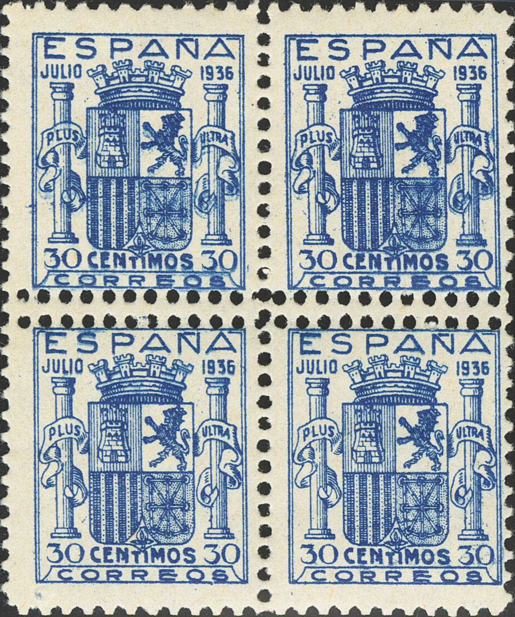★★ 801(2), 801dd(2). 1936. 30 cts azul, bloque de cuatro (un sello punto de aguja). Variedad DOBLE DENTADO, en el centro. MAGNIFICO Y MUY RARO. Edifil 2025: 4.050 Euros