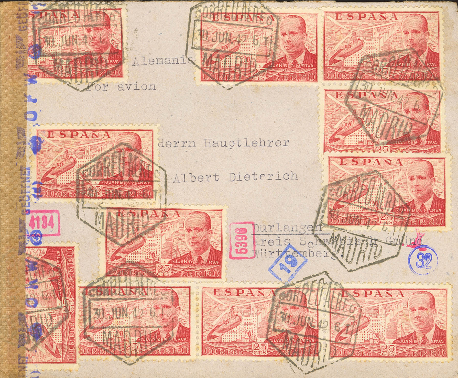 881(11). 1942. 25 cts rojo, once sellos. Correo Aéreo de MADRID a DURLANGEN (ALEMANIA). En el frente diversas marcas de control del correo alemán. MAGNIFICA.